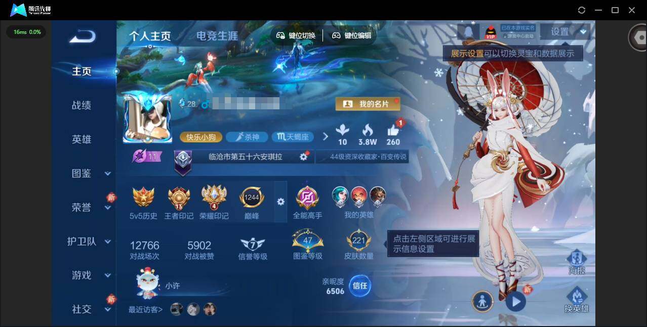 实名: 可修改 贵族等级: V6 英雄数: 127 皮肤数: 221 荣耀水晶