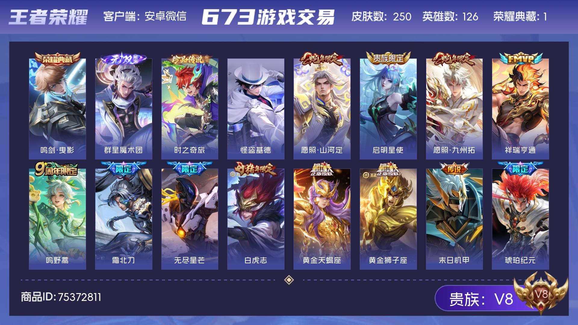V8 皮肤250 英雄126 最强王者 荣耀典藏1 无双皮肤1 珍品传说2 传说27 其他皮肤225