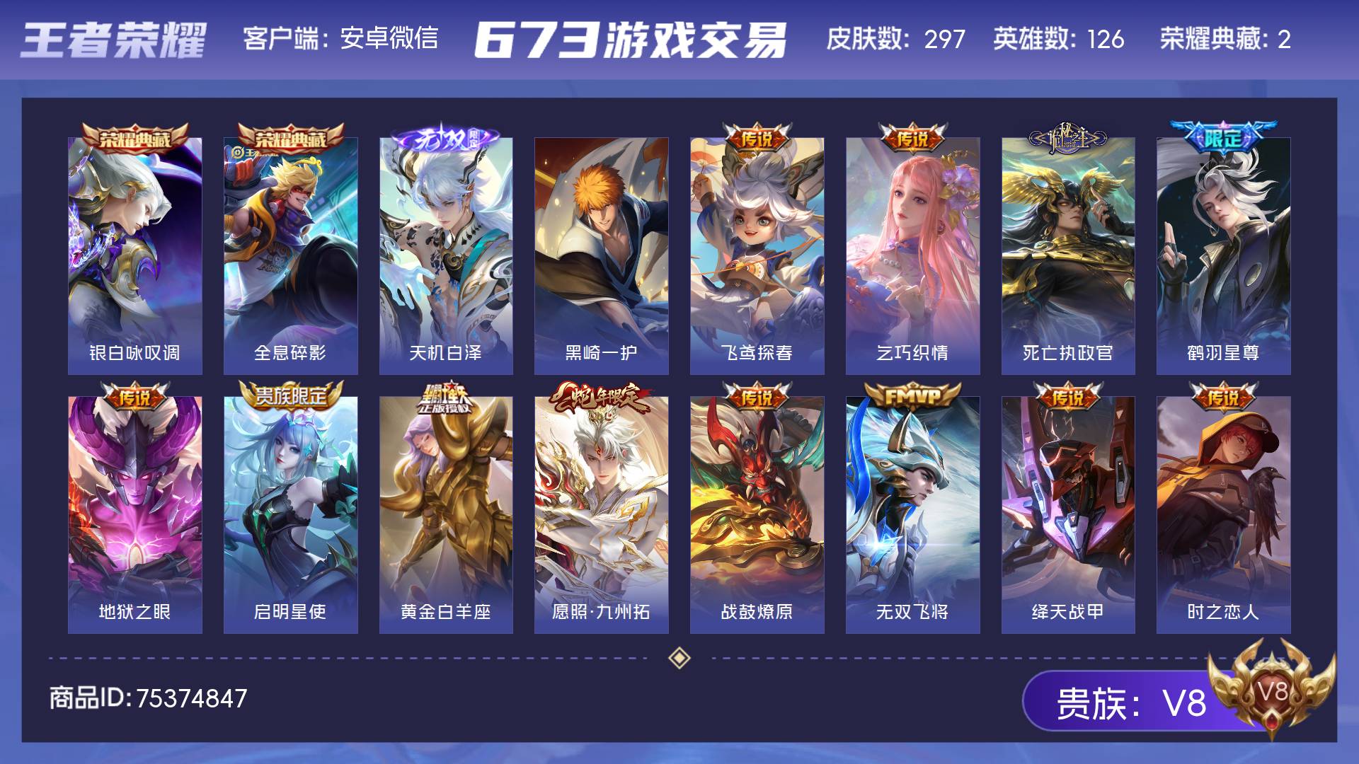 V8 皮肤297 英雄126 至尊星耀 荣耀典藏2 无双皮肤1 珍品传说1 传说17 其他皮肤281