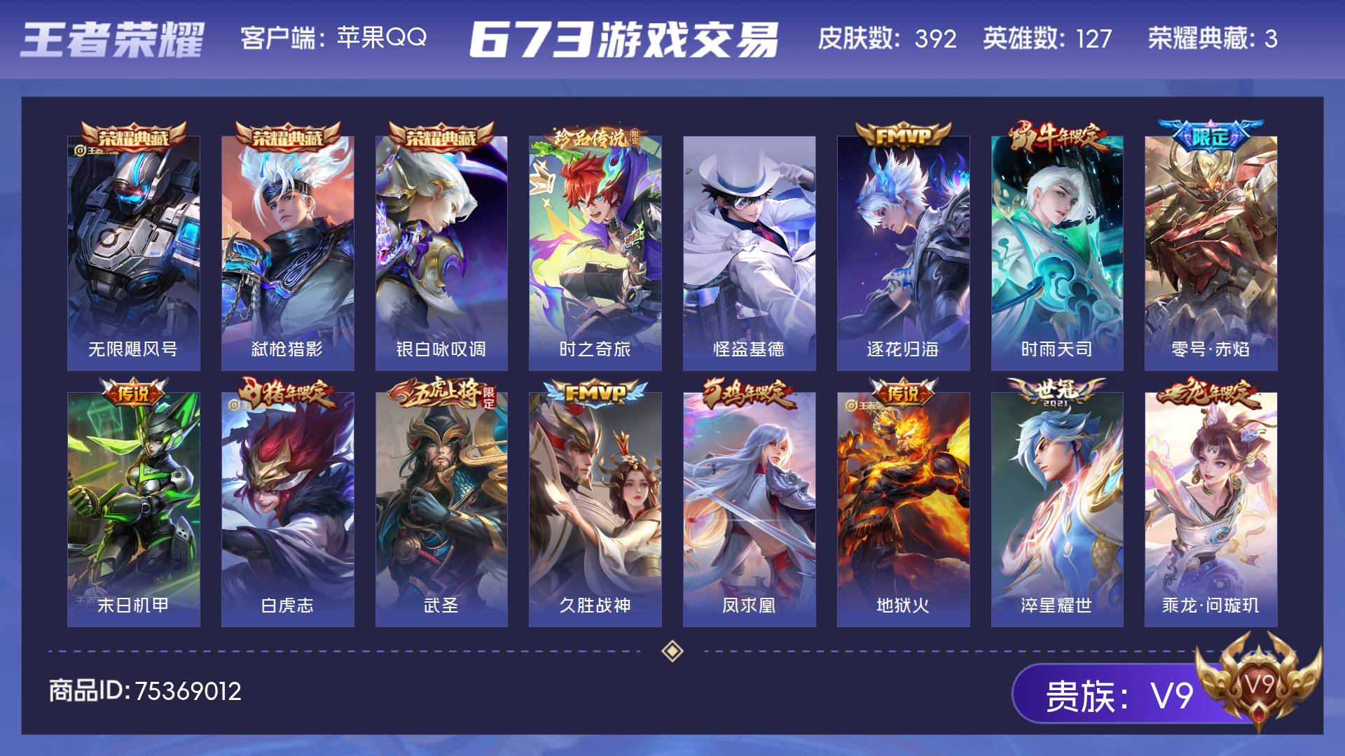 V9 皮肤392 英雄127 永恒钻石 荣耀典藏3 珍品传说2 传说21 其他皮肤371