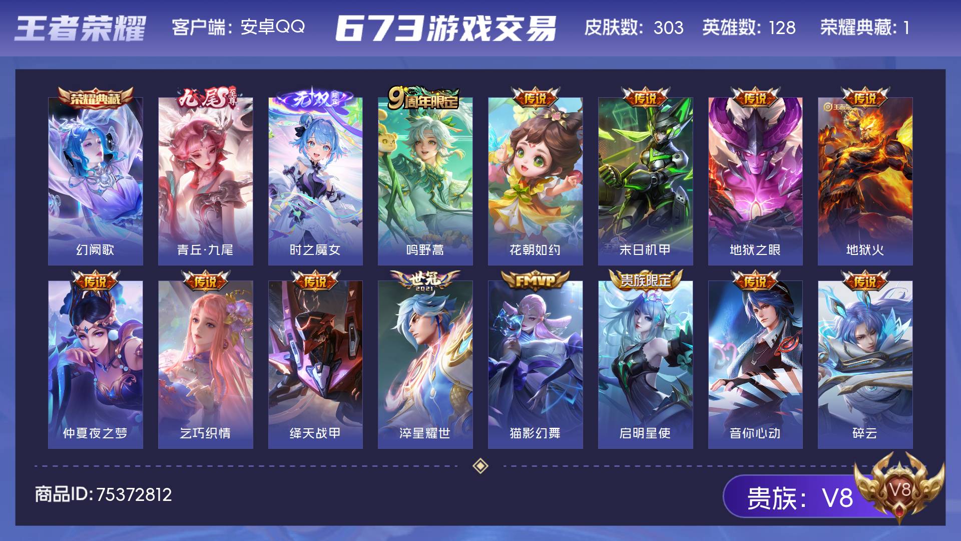 V8 皮肤303 英雄128 至尊星耀 荣耀典藏1 无双皮肤2 传说21 其他皮肤283