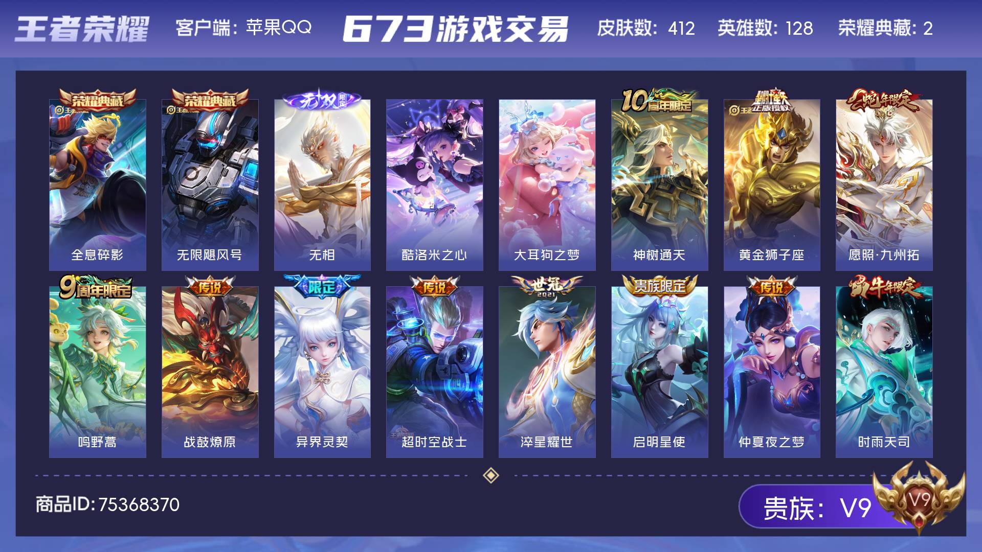 V9 皮肤412 英雄128 至尊星耀 荣耀典藏2 无双皮肤1 珍品传说2 星传说5 传说18 其他皮肤391