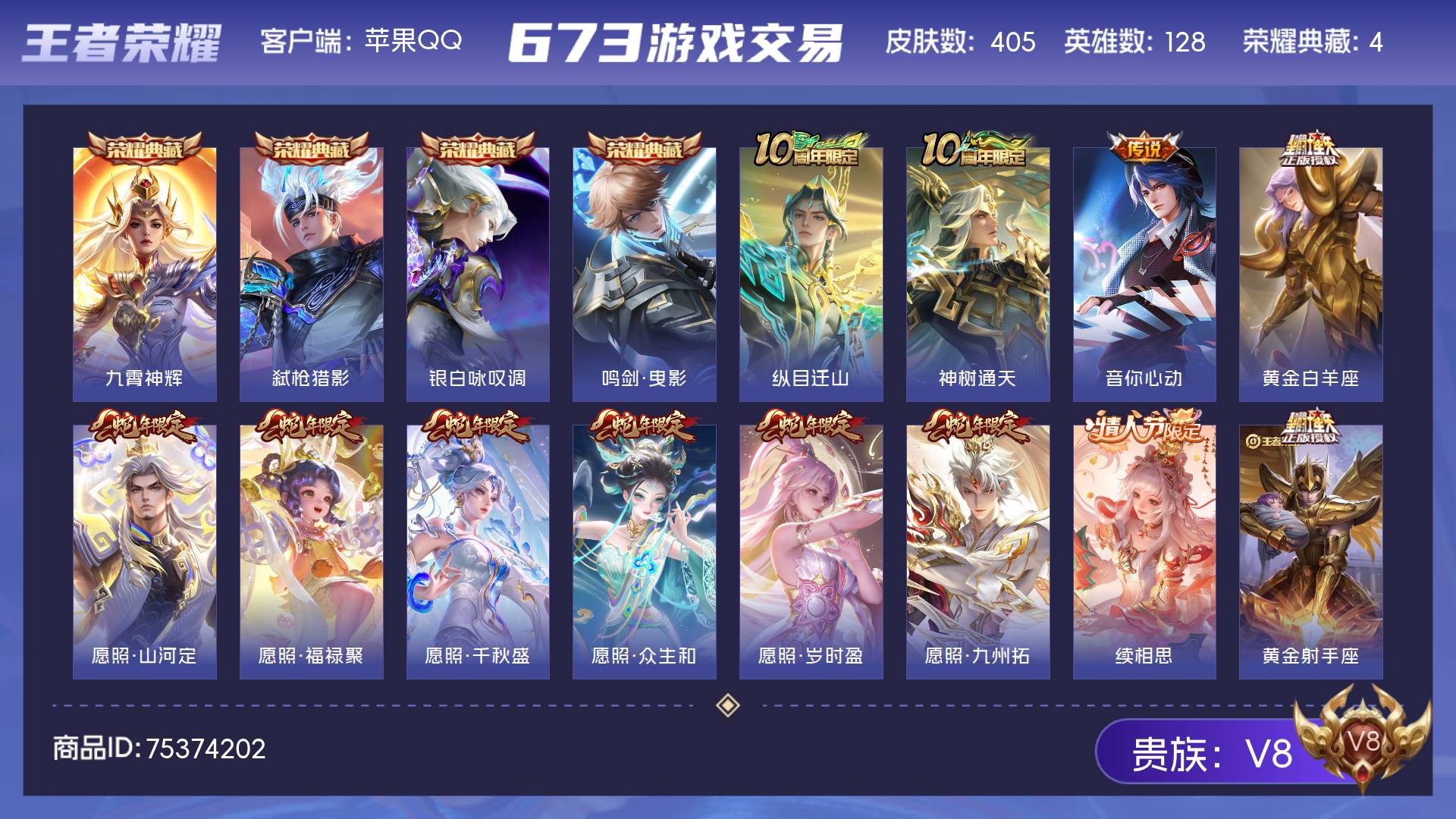 V8 皮肤405 英雄128 至尊星耀 荣耀典藏4 传说36 其他皮肤371