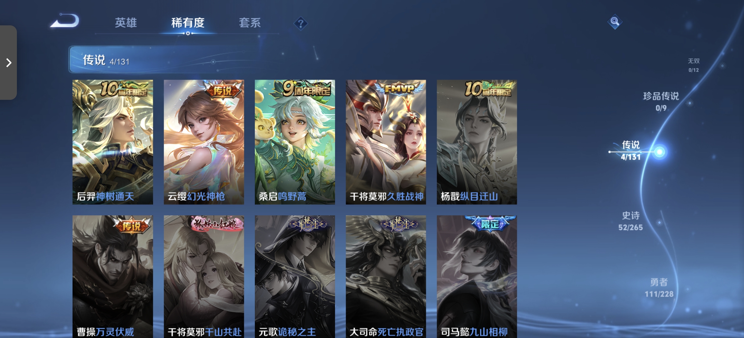 皮肤286 英雄125 荣耀王者 荣耀典藏1 无双皮肤1 珍品传说3 传说15 其他皮肤106-曜无双皮,朽木白哉还有黑崎一护,夏洛特浮生妄还有宫本地狱之眼,还有嫦娥杨玉环珍品皮澜的年限亚瑟狮心王