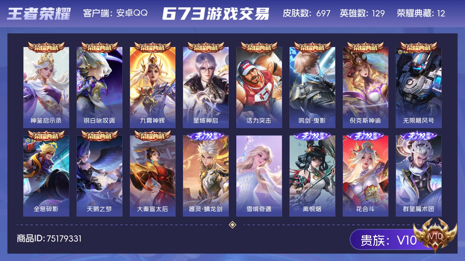 V10 皮肤697 英雄129 尊贵铂金 荣耀典藏12 无双皮肤10 珍品传说7 星传说9 传说123 其他皮肤551