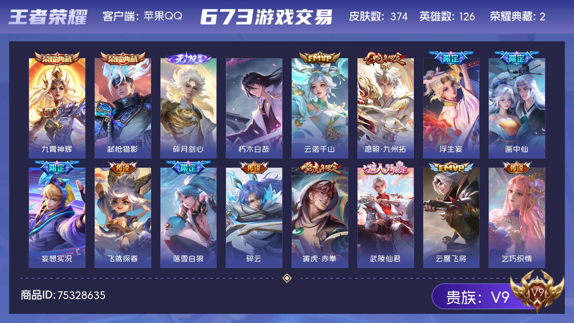 V9 皮肤374 英雄126 至尊星耀 荣耀典藏2 无双皮肤1 珍品传说1 传说37 其他皮肤338