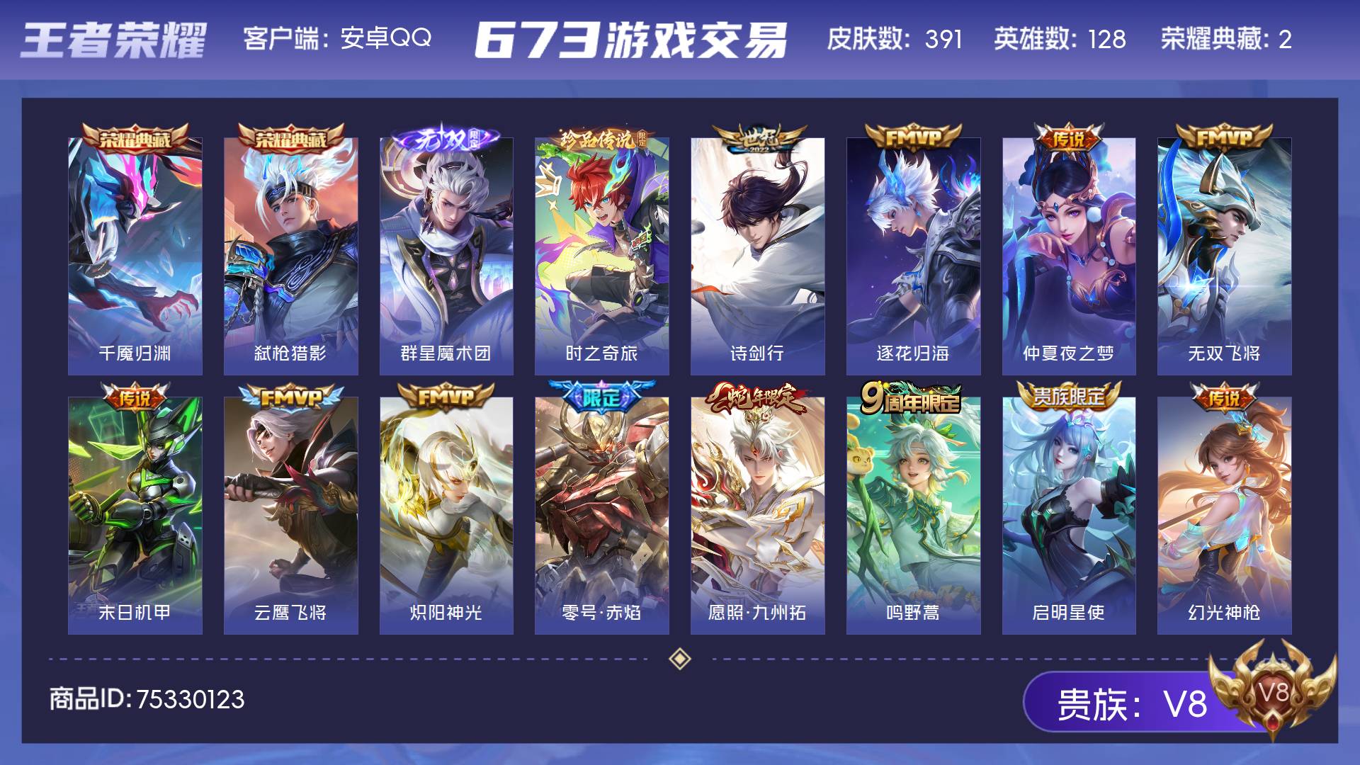 V8 皮肤391 英雄128 永恒钻石 荣耀典藏2 无双皮肤1 珍品传说1 传说12 其他皮肤379