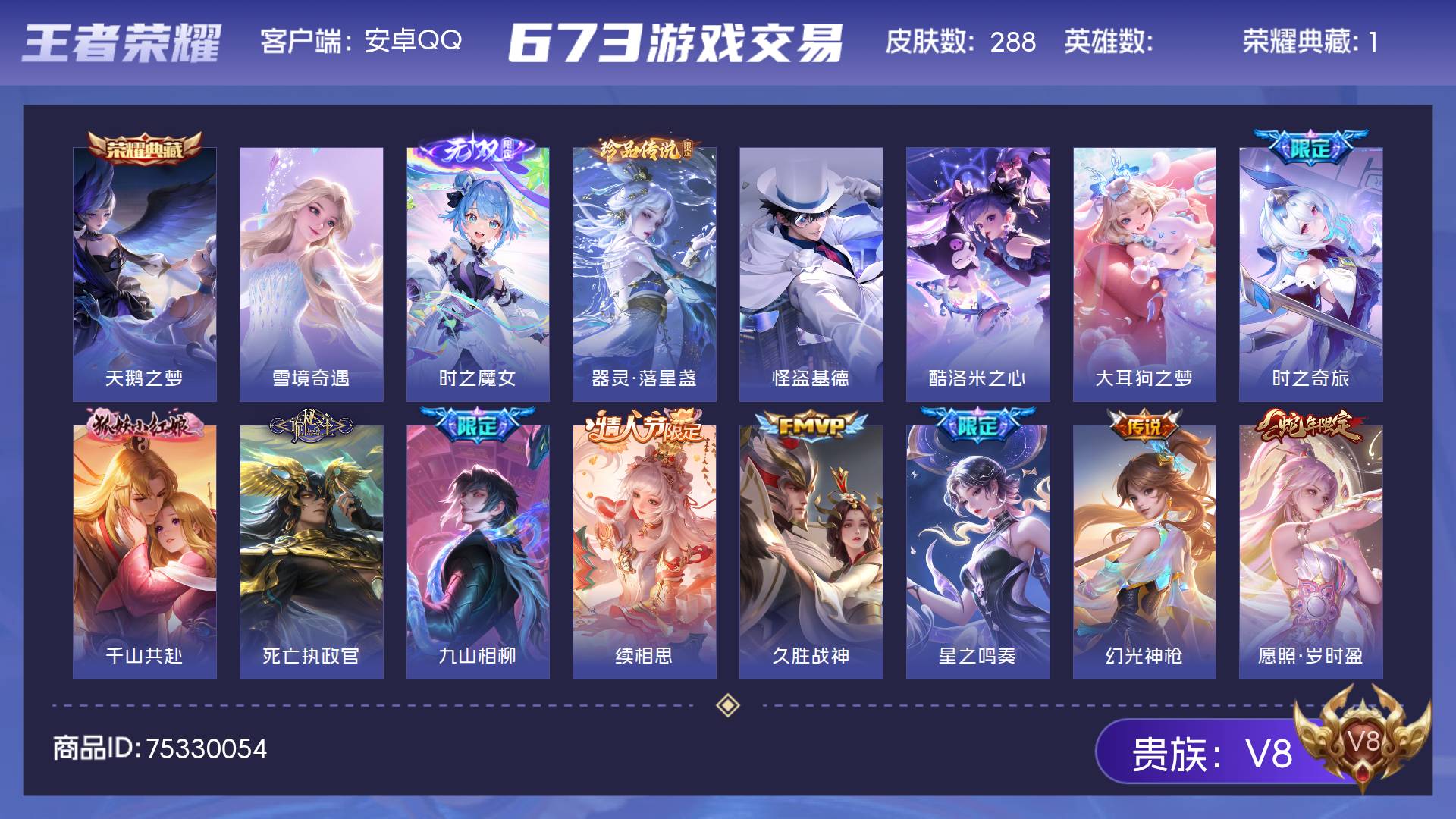 V8 皮肤288 至尊星耀 荣耀典藏1 无双皮肤2 珍品传说4 传说26 其他皮肤260