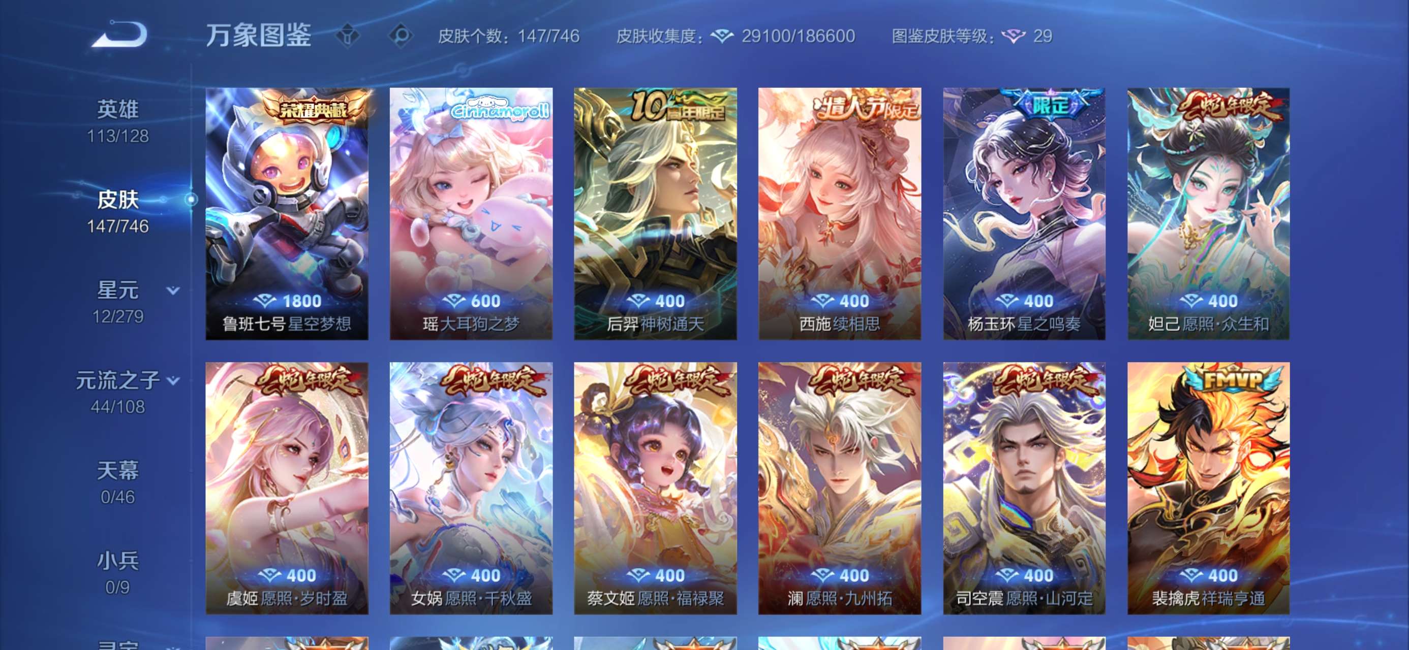 皮肤29 英雄43 非凡王者 传说1 其他皮肤33