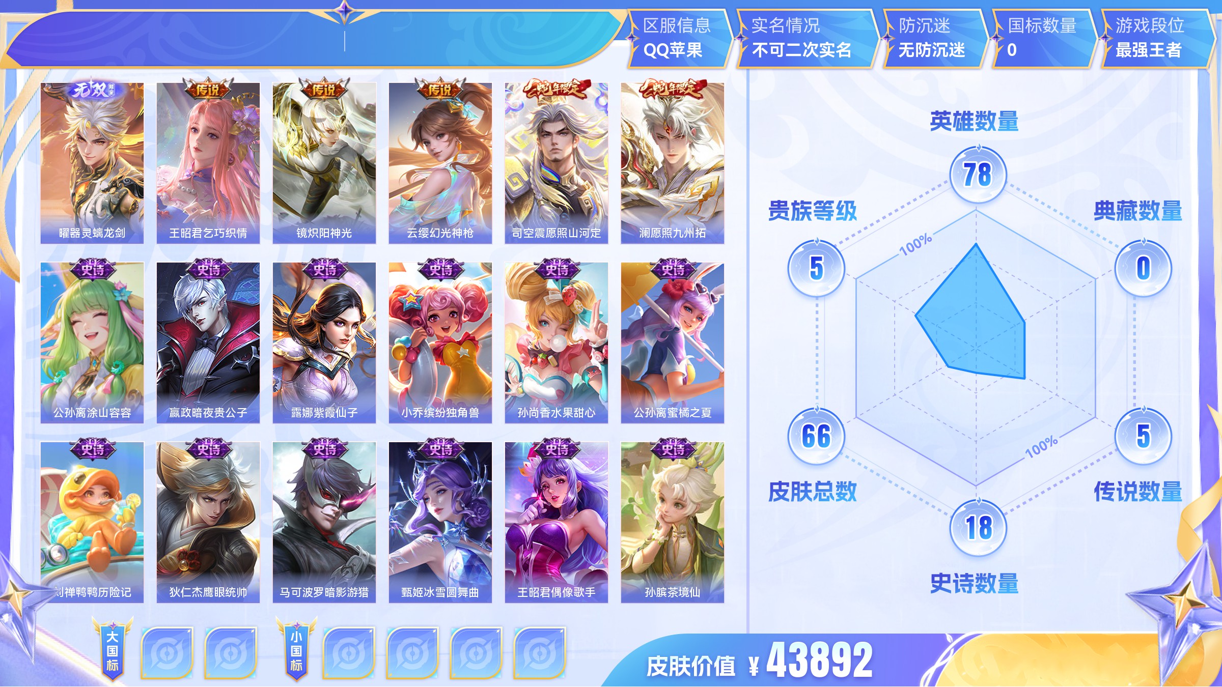 无双1 传说5 史诗18 限定24 英雄78 皮肤66
