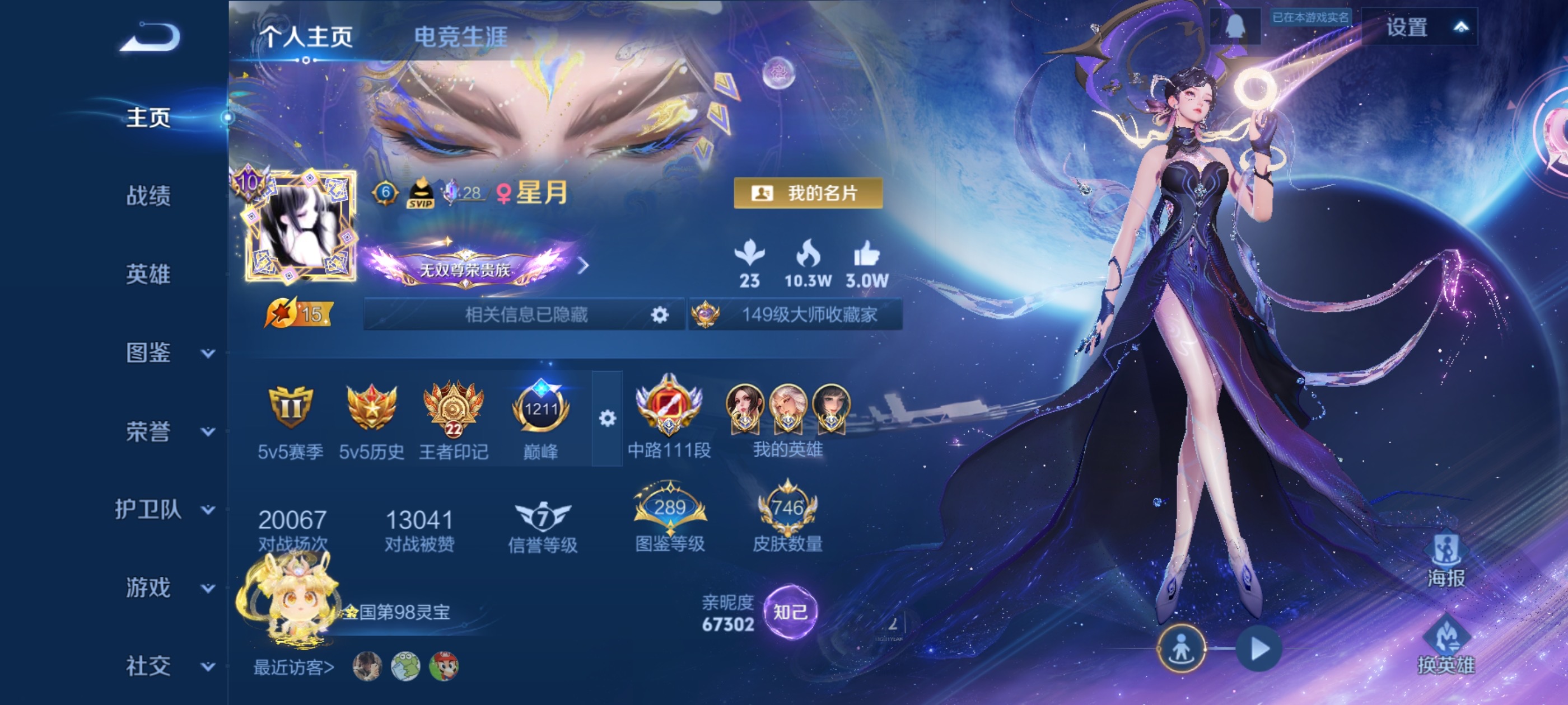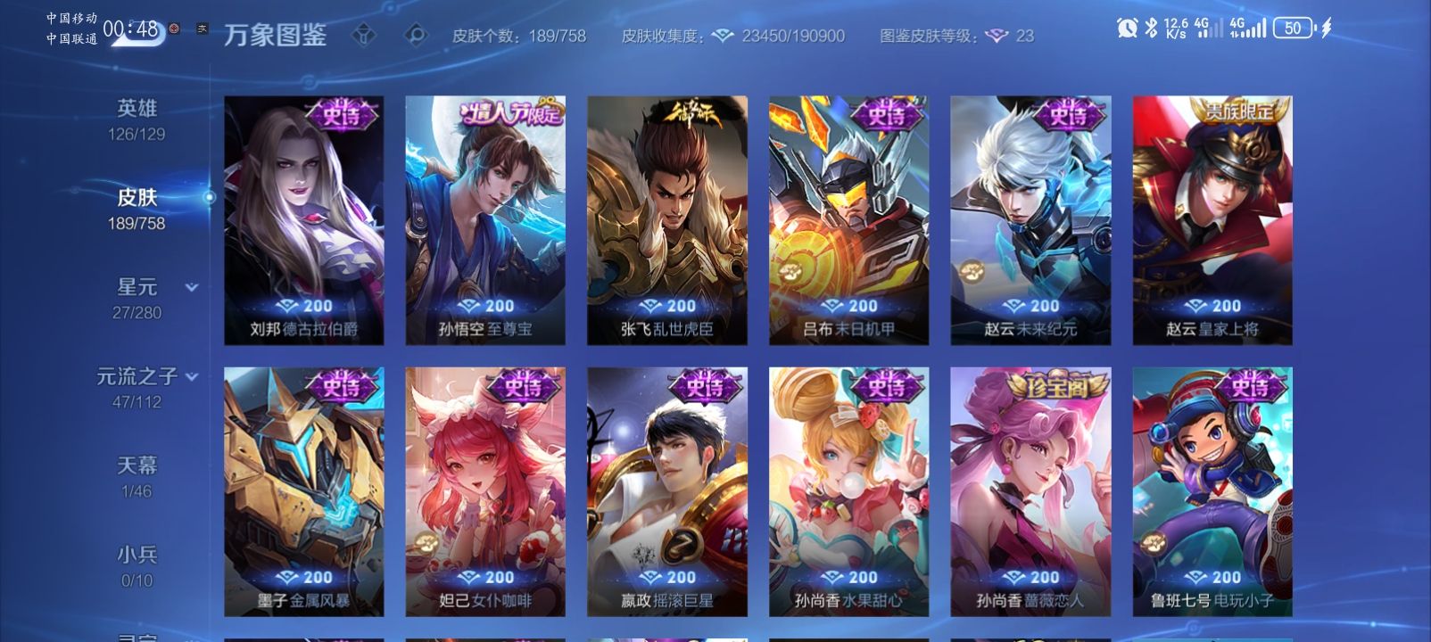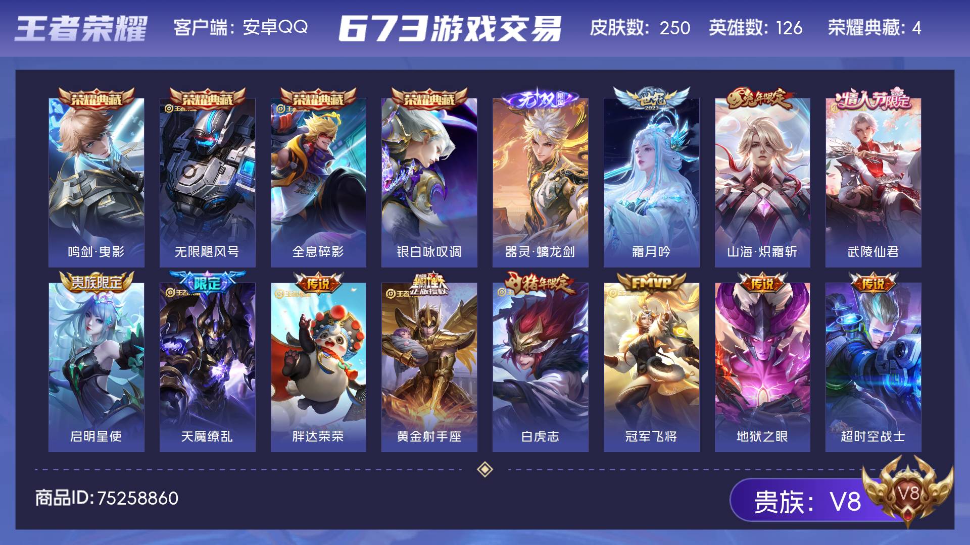 V8 皮肤250 英雄126 至尊星耀 荣耀典藏4 无双皮肤1 传说13 其他皮肤237