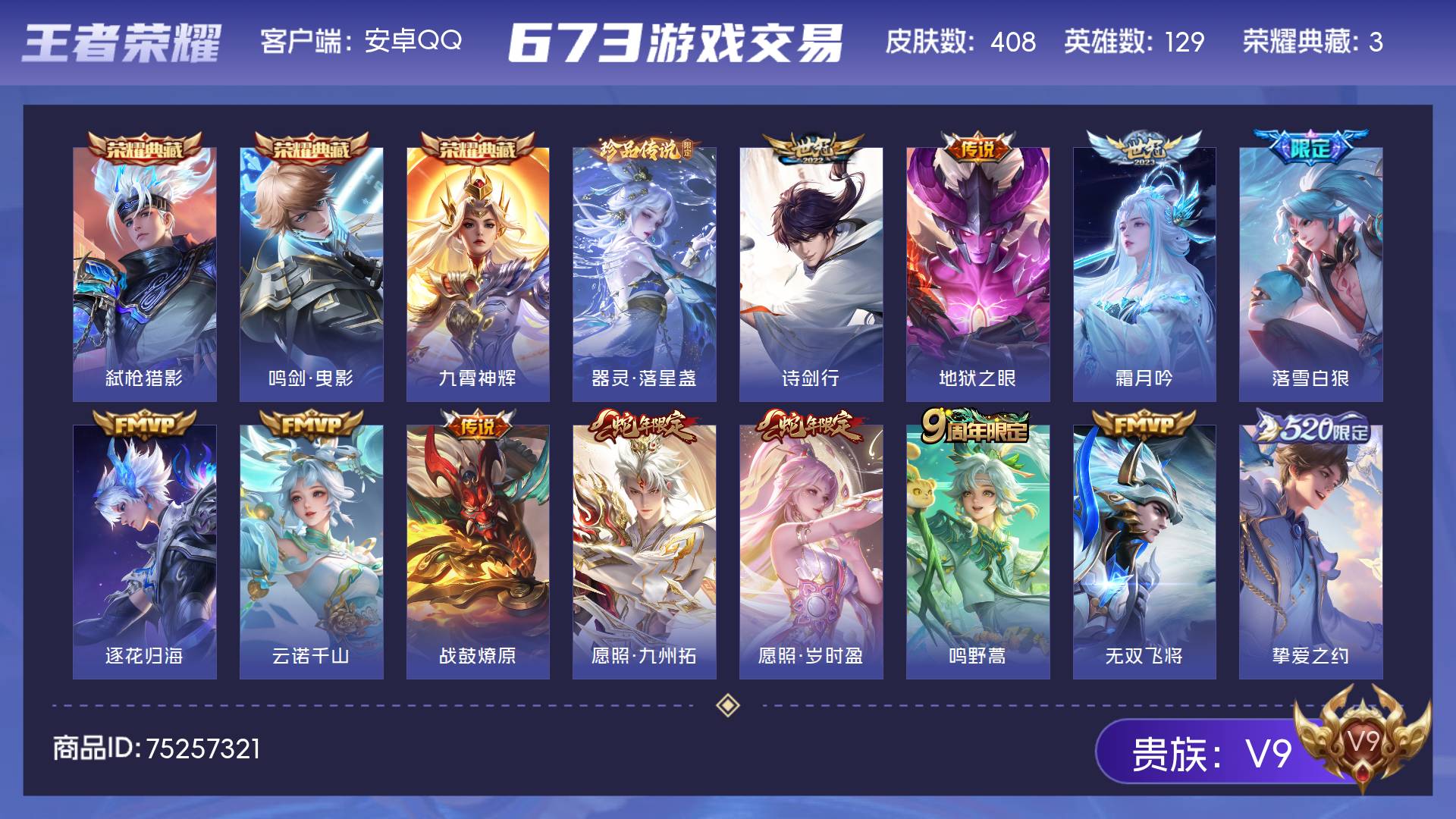 V9 皮肤408 英雄129 至尊星耀 荣耀典藏3 珍品传说1 传说39 其他皮肤371