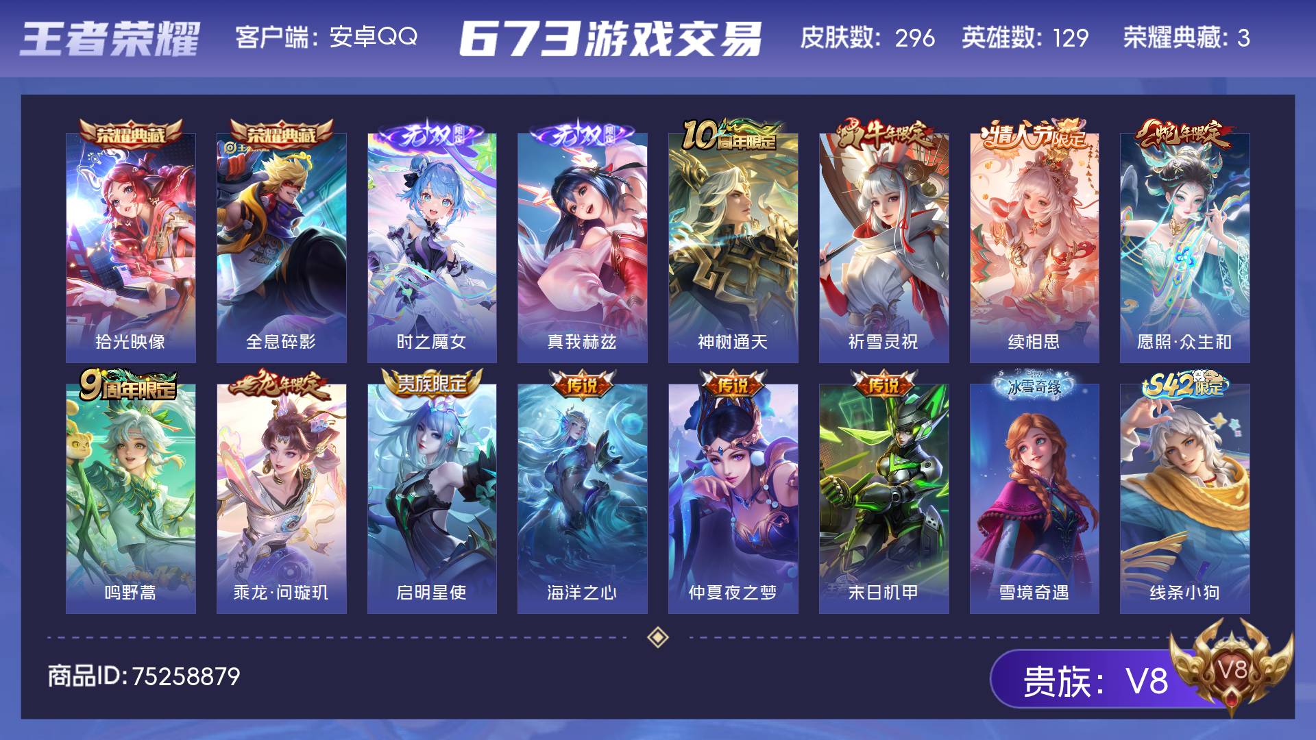 V8 皮肤296 英雄129 至尊星耀 荣耀典藏3 无双皮肤2 传说10 其他皮肤287
