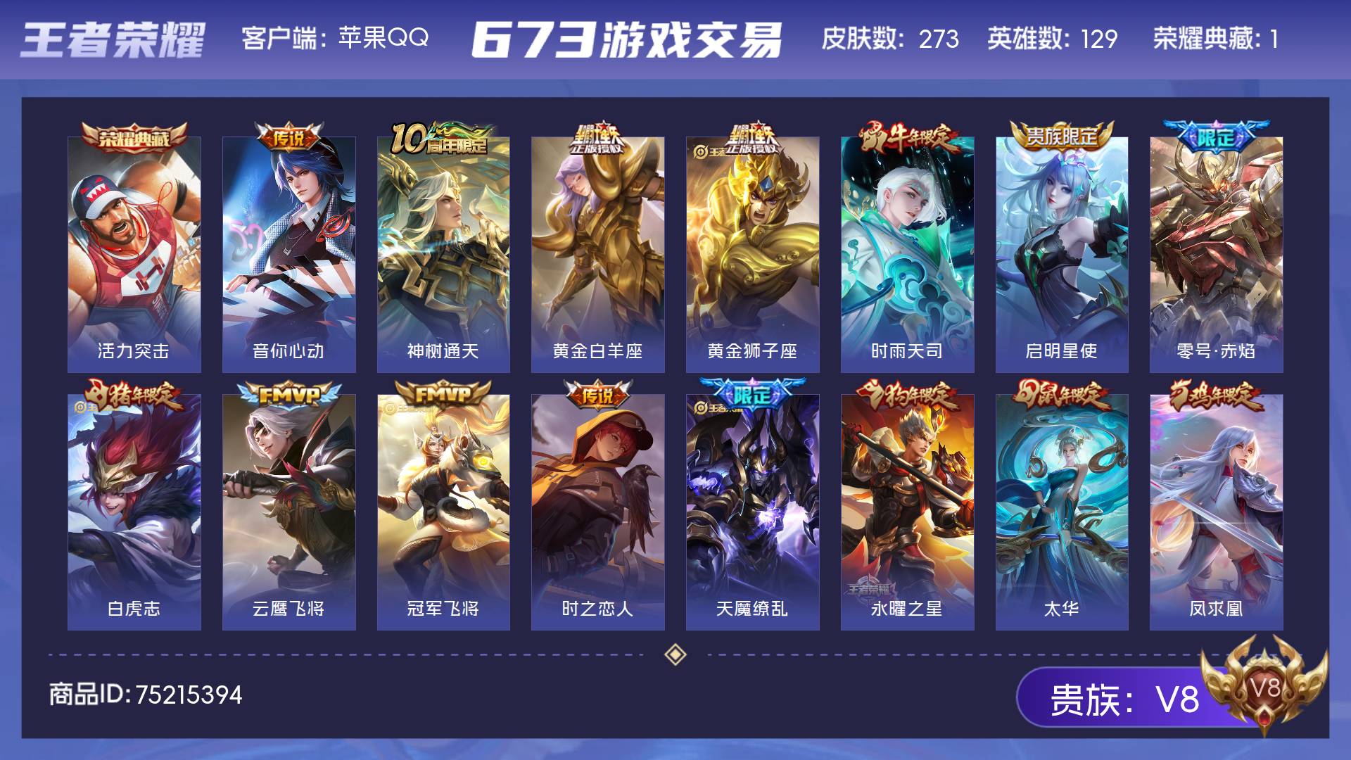 V8 皮肤273 英雄129 永恒钻石 荣耀典藏1 星传说2 传说20 其他皮肤258