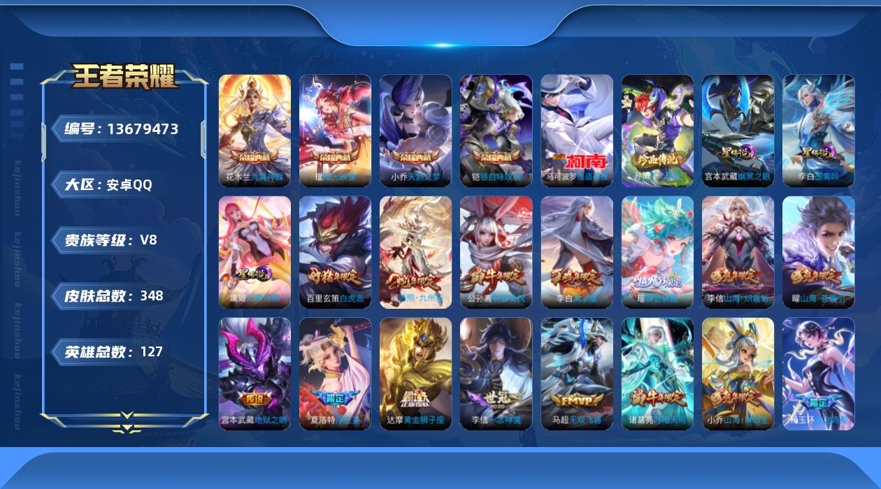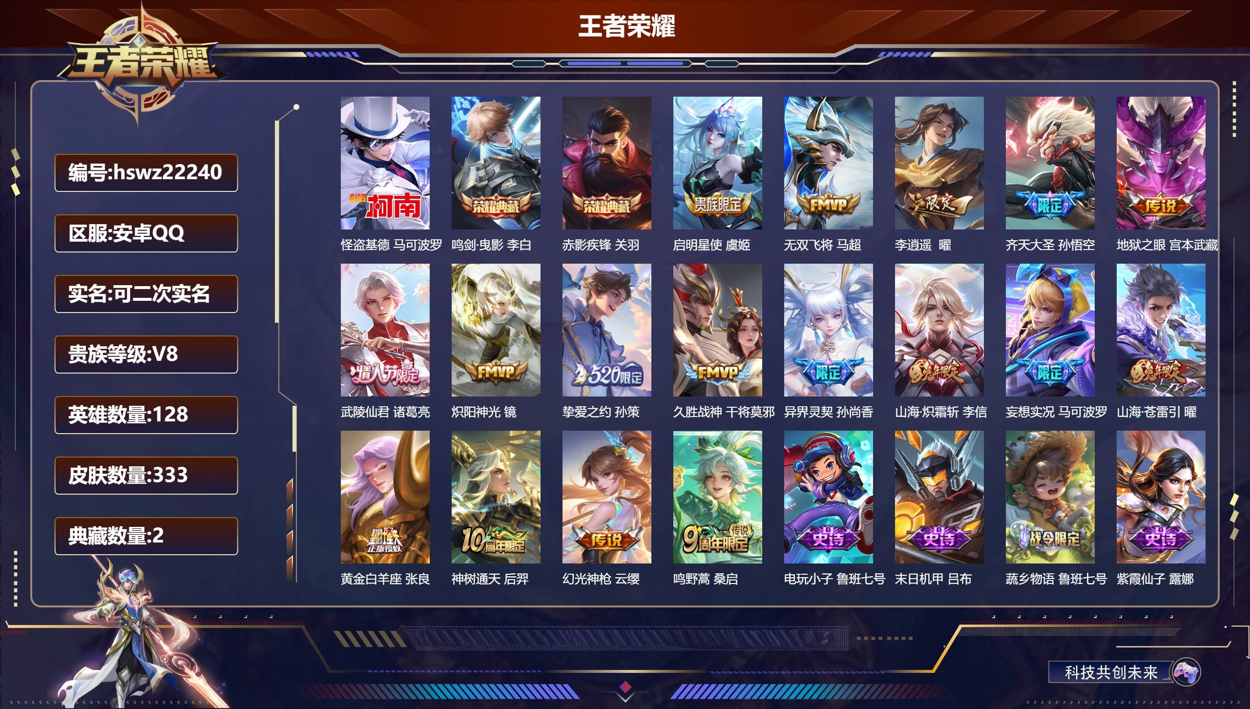 安卓QQ/至尊星耀/333皮肤/128英雄/2典藏/0珍品无双/0无双/1珍品传说/17传说/114
