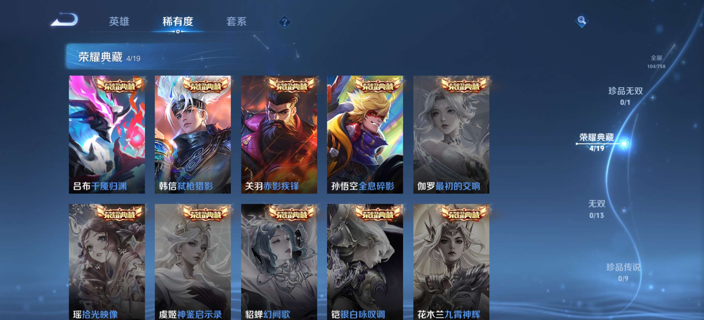 V8 皮肤284 英雄129 至尊星耀 荣耀典藏1 无双皮肤1 珍品传说1 星传说3 传说19 其他皮肤268