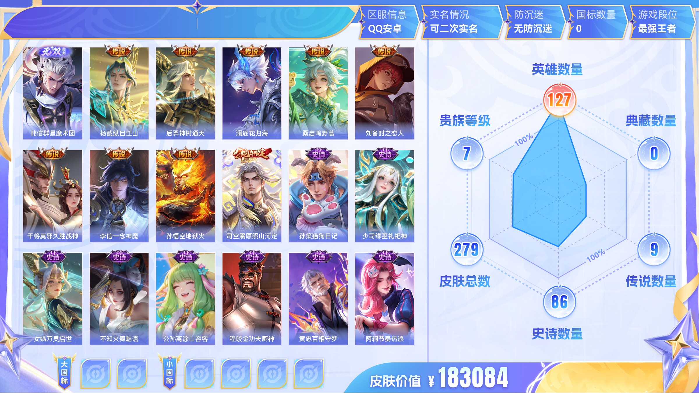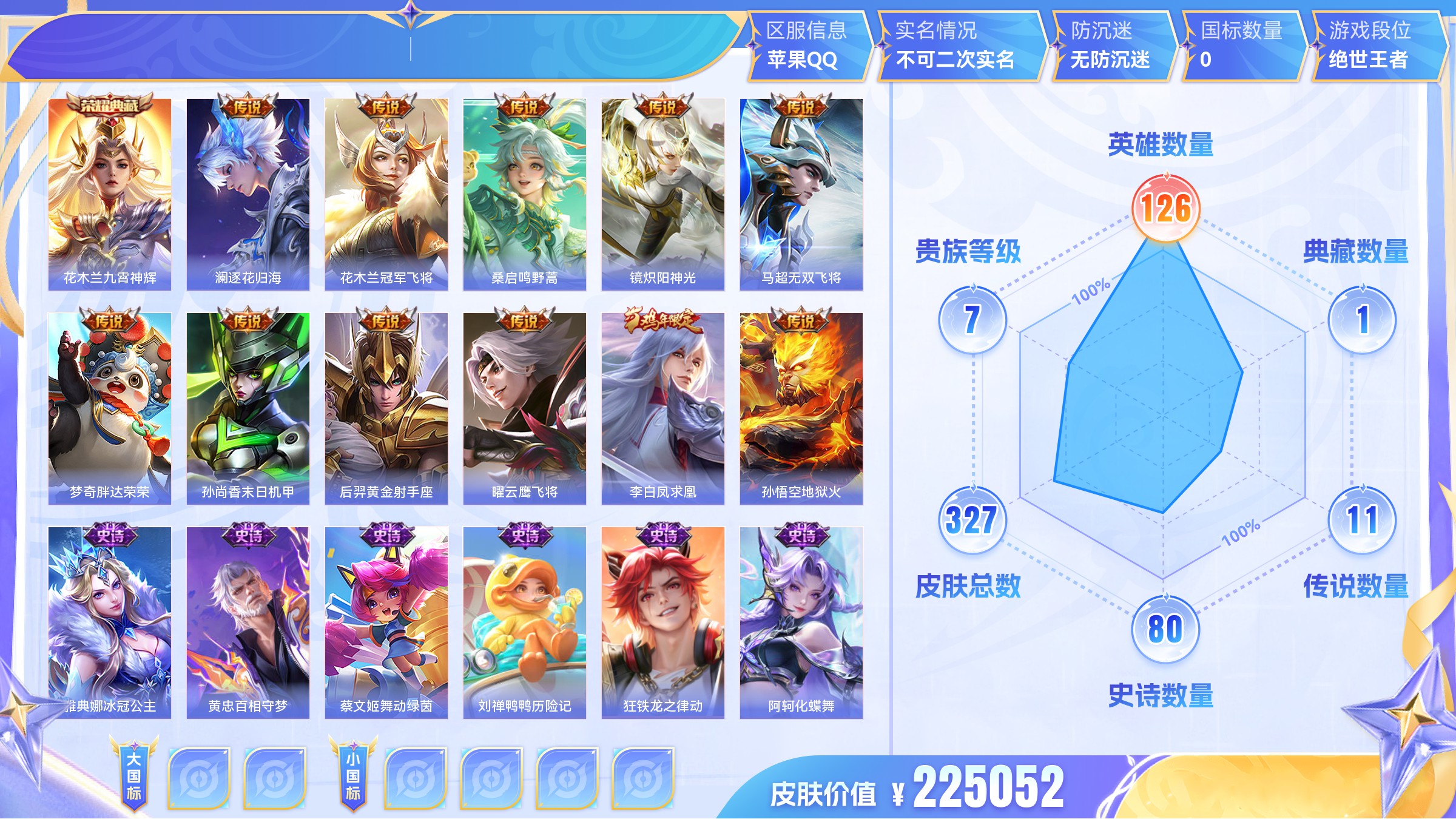 典藏1 传说11 史诗80 限定86 英雄127 皮肤2