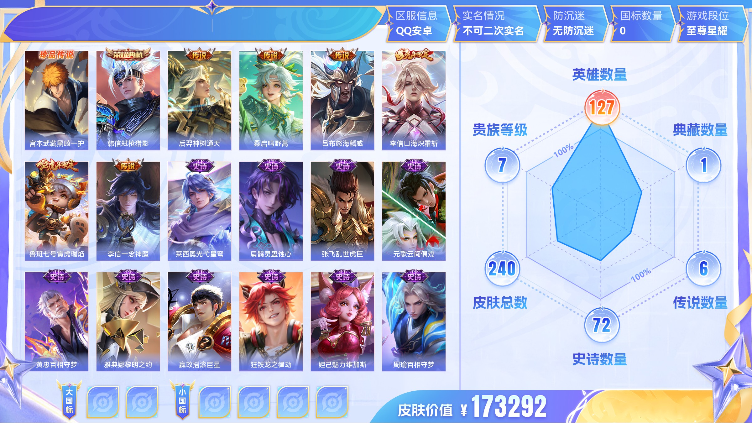 典藏1 传说16 史诗95 限定99 英雄127 皮肤3