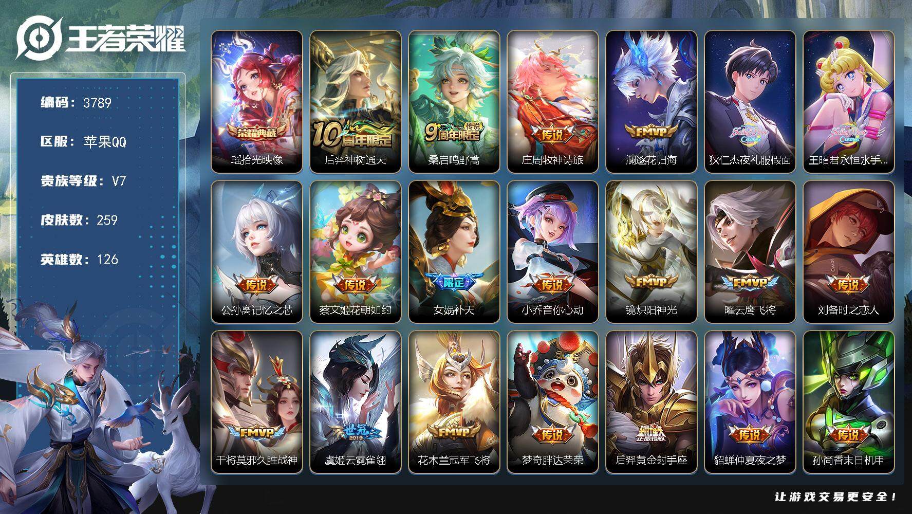 苹果Q-V7-最强王者段位-126英雄-259皮肤-1典藏皮肤-20传说-63