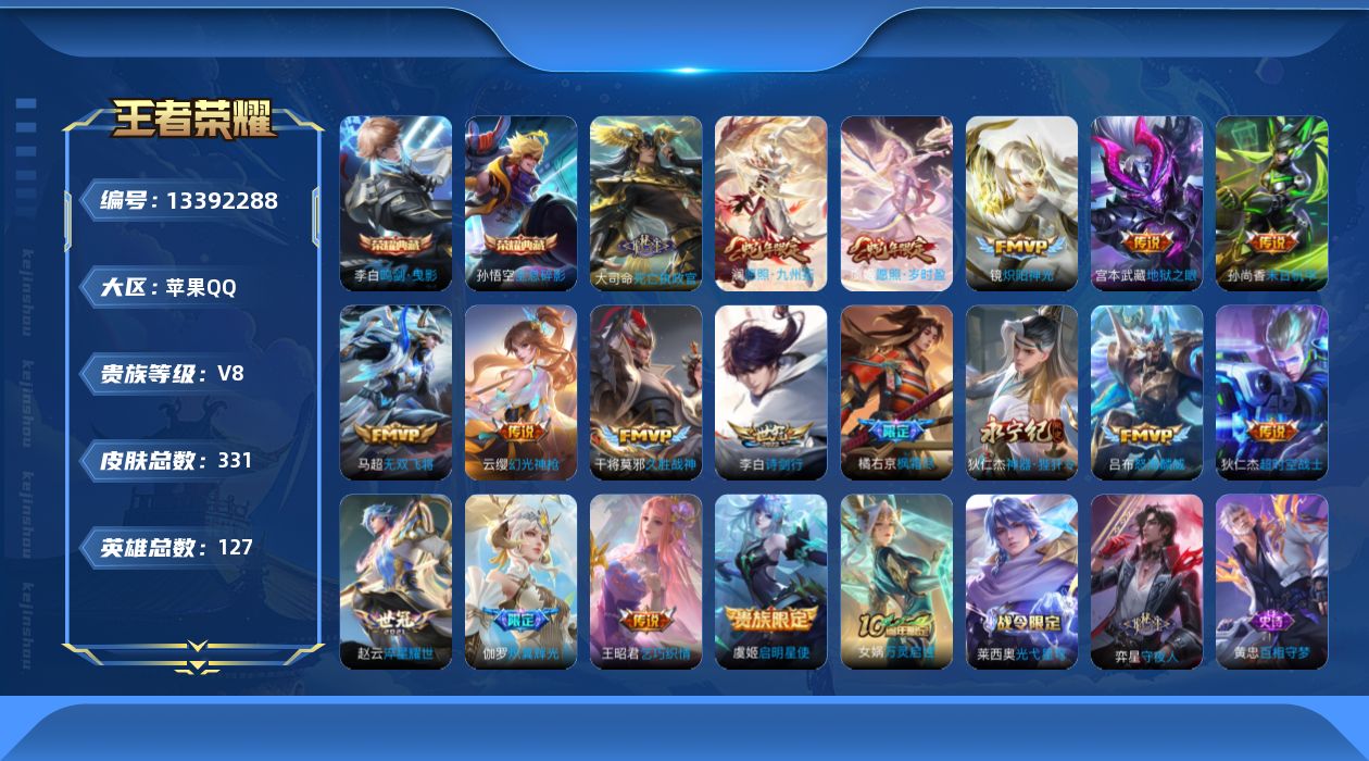 王者荣耀【苹果QQ】ky小国伽罗 省5虞姬 省6黄忠 省9狄仁杰 发育72段 可认证苹果(q)区 331皮 2典藏