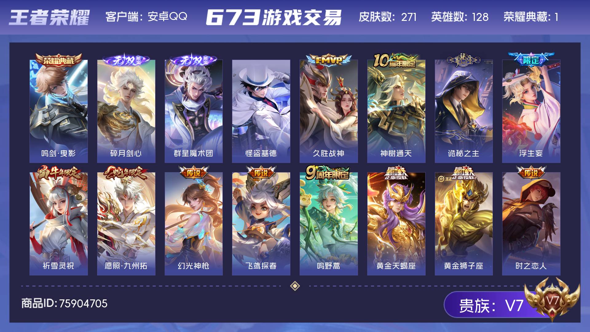 V7 皮肤271 英雄128 至尊星耀 荣耀典藏1 无双皮肤2 珍品传说1 传说18 其他皮肤255