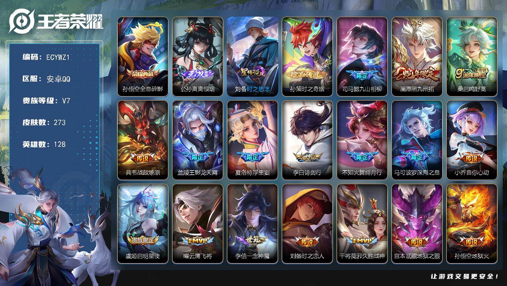可二次,安卓Q-128英雄-273皮肤-1典藏皮肤-1无双-1珍品传说-17传说