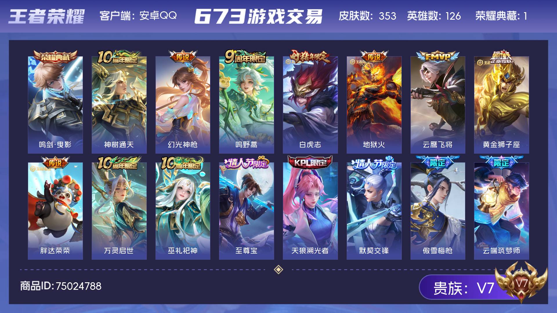 皮肤353 英雄126 荣耀王者 荣耀典藏1 传说8 其他皮肤133-贵族等级: V7 英雄皮肤自己