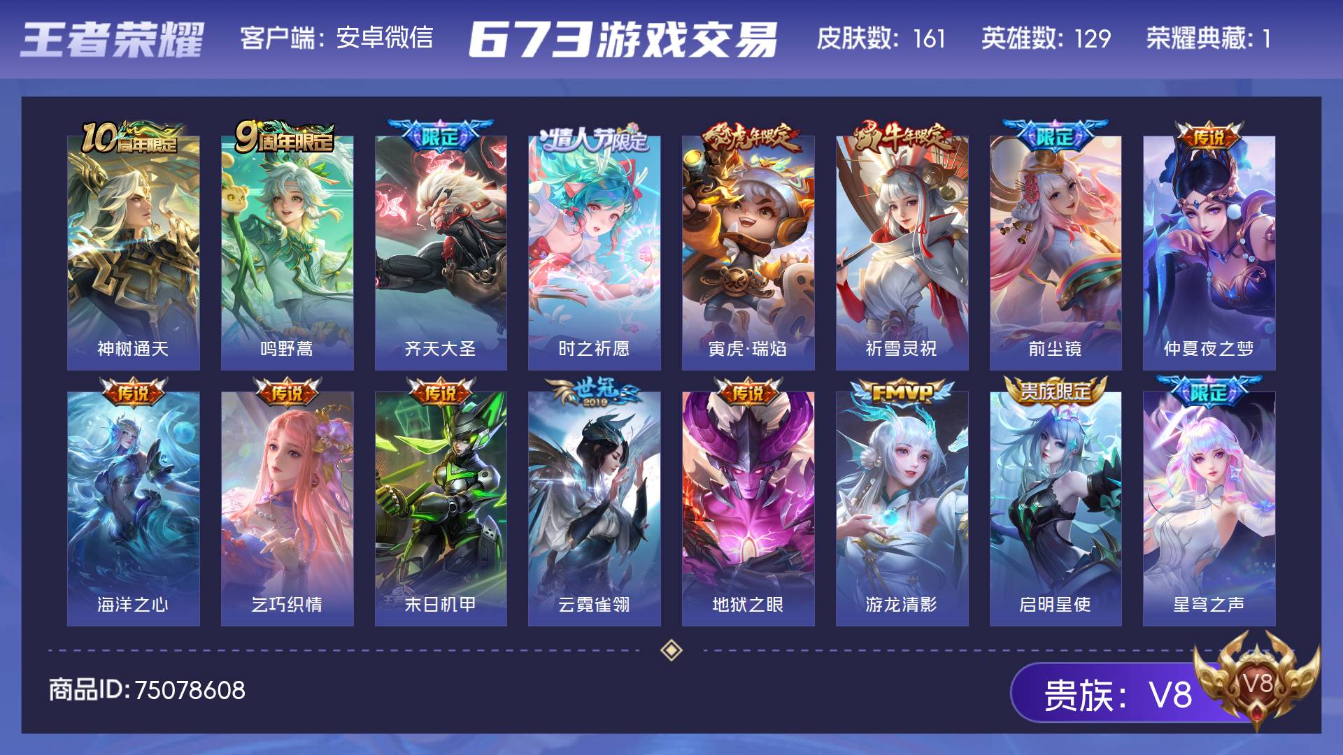V8 皮肤161 英雄129 尊贵铂金 荣耀典藏1 星传说3 传说16 其他皮肤152