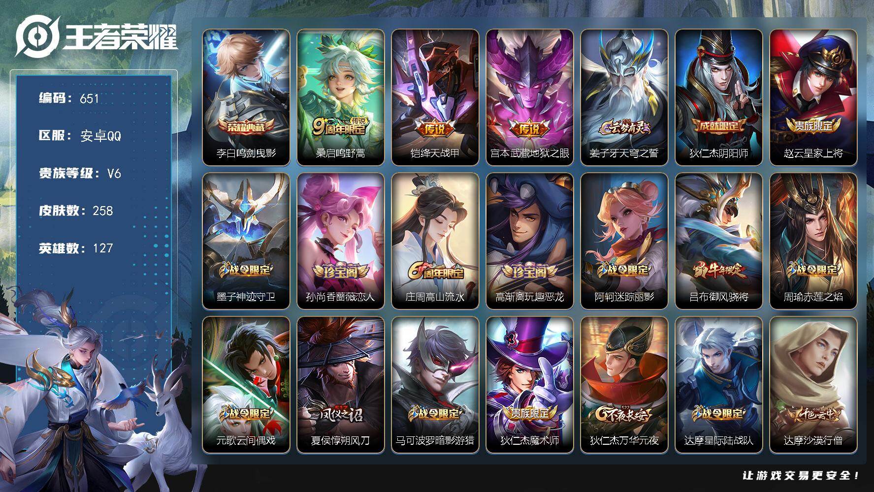 安卓Q-V6-最强王者段位-127英雄-258皮肤-1典藏皮肤-3传说-57史