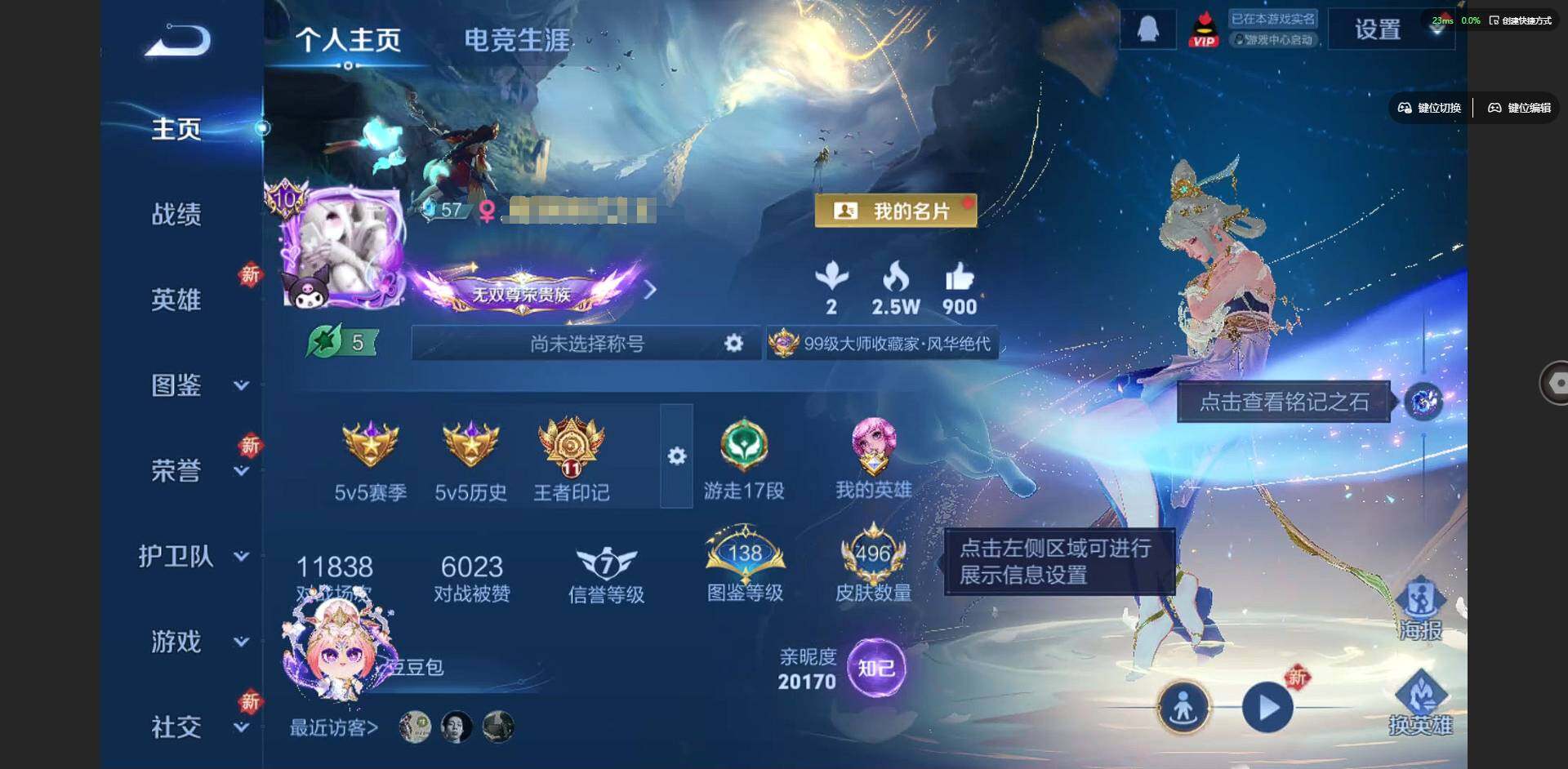 实名: 可修改 贵族等级: V7 英雄数: 127 皮肤数: 225 荣耀水晶