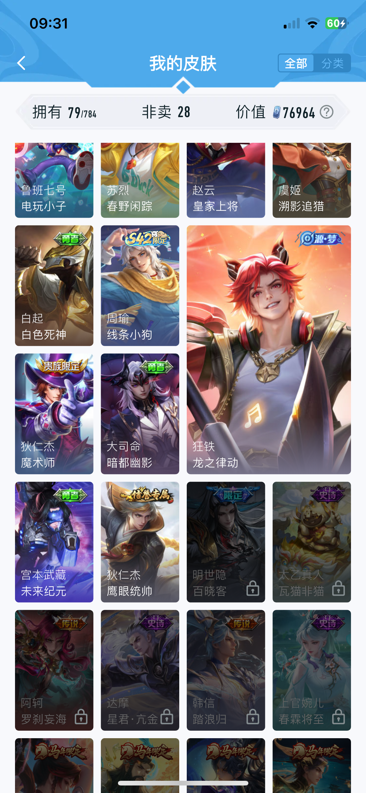 V10 皮肤377 英雄129 尊贵铂金 荣耀典藏4 无双皮肤1 星传说2 传说53 其他皮肤326