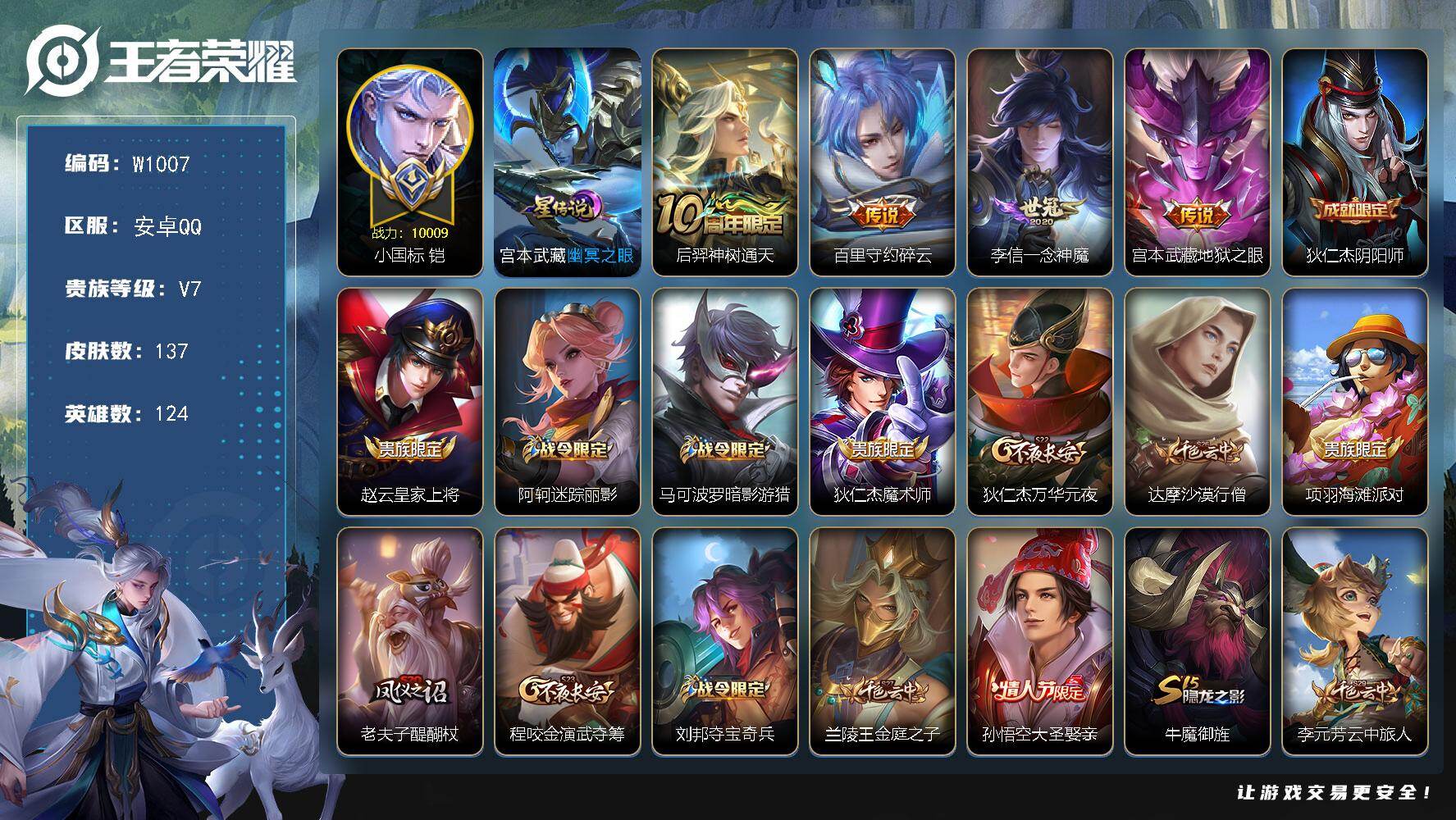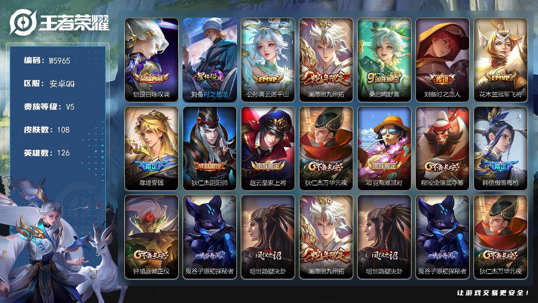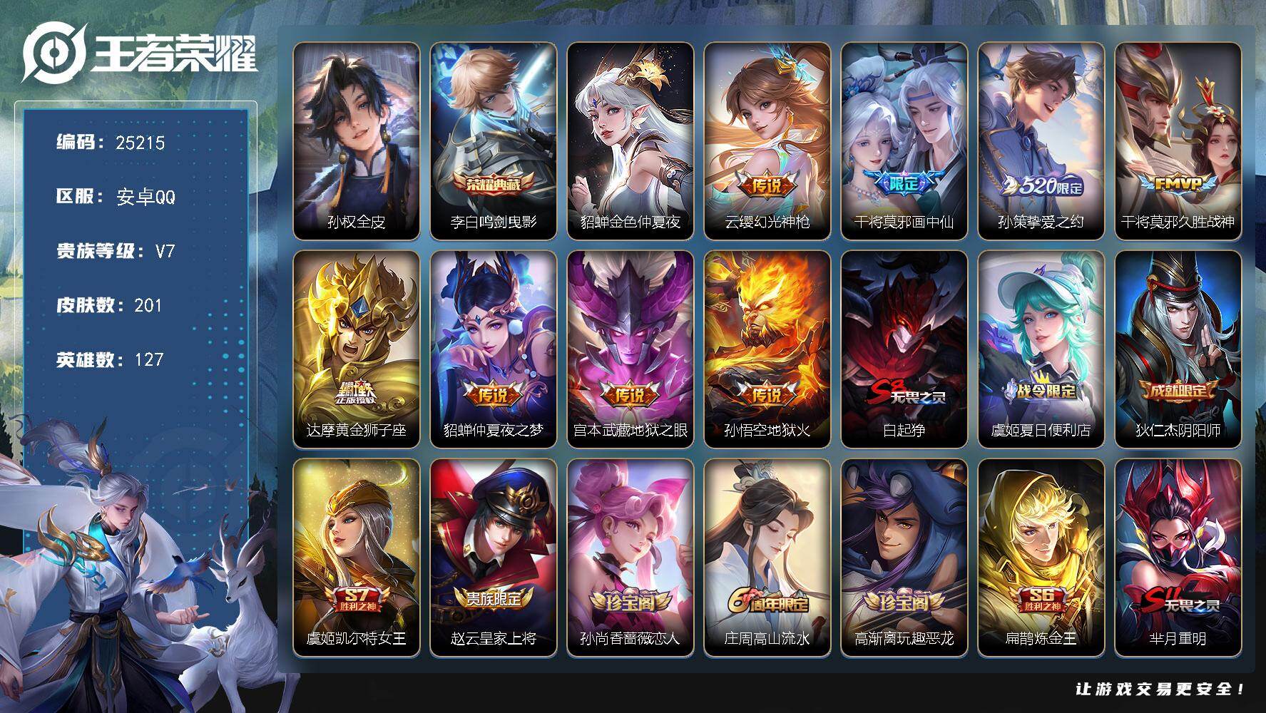 【W5966】安卓Q区-无二次-贵7-128英雄-313皮肤-2典藏-9传说-