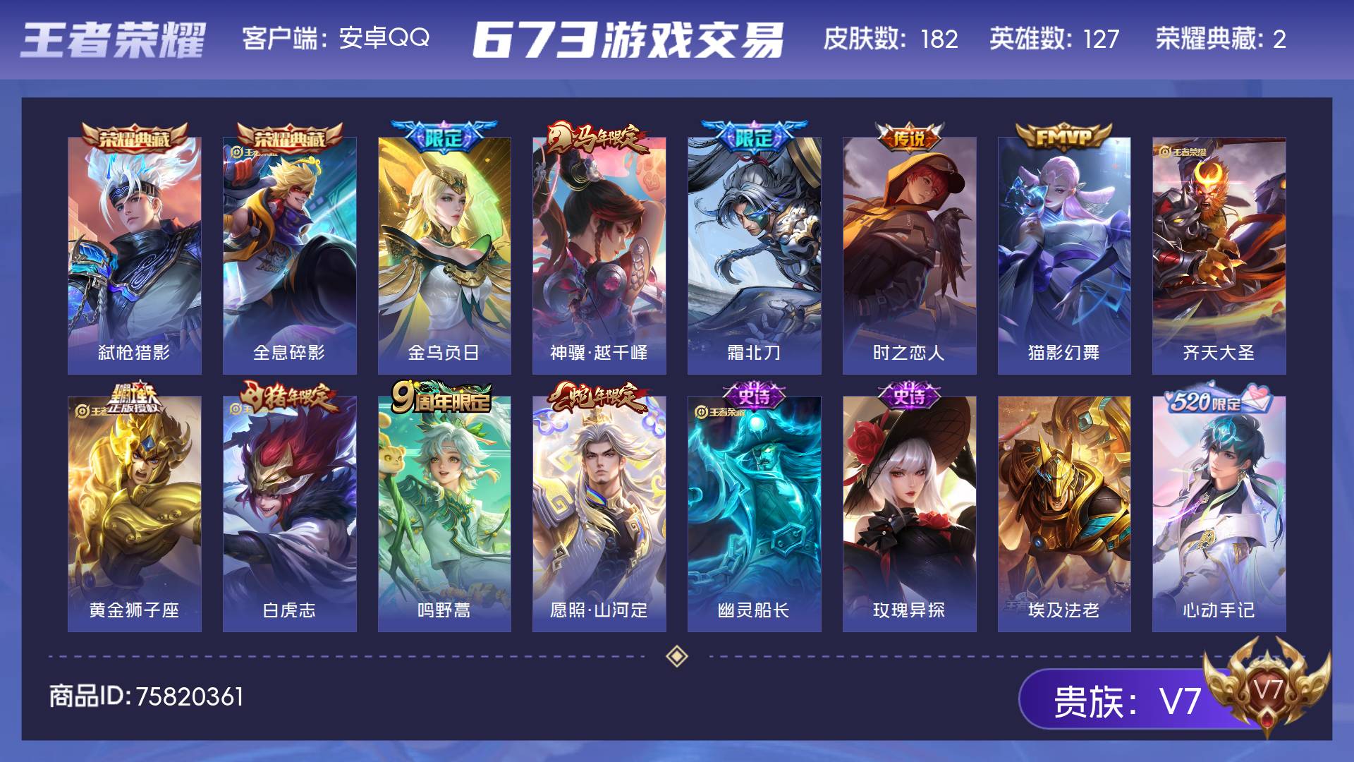 V7 皮肤182 英雄127 荣耀王者 荣耀典藏2 传说10 其他皮肤177