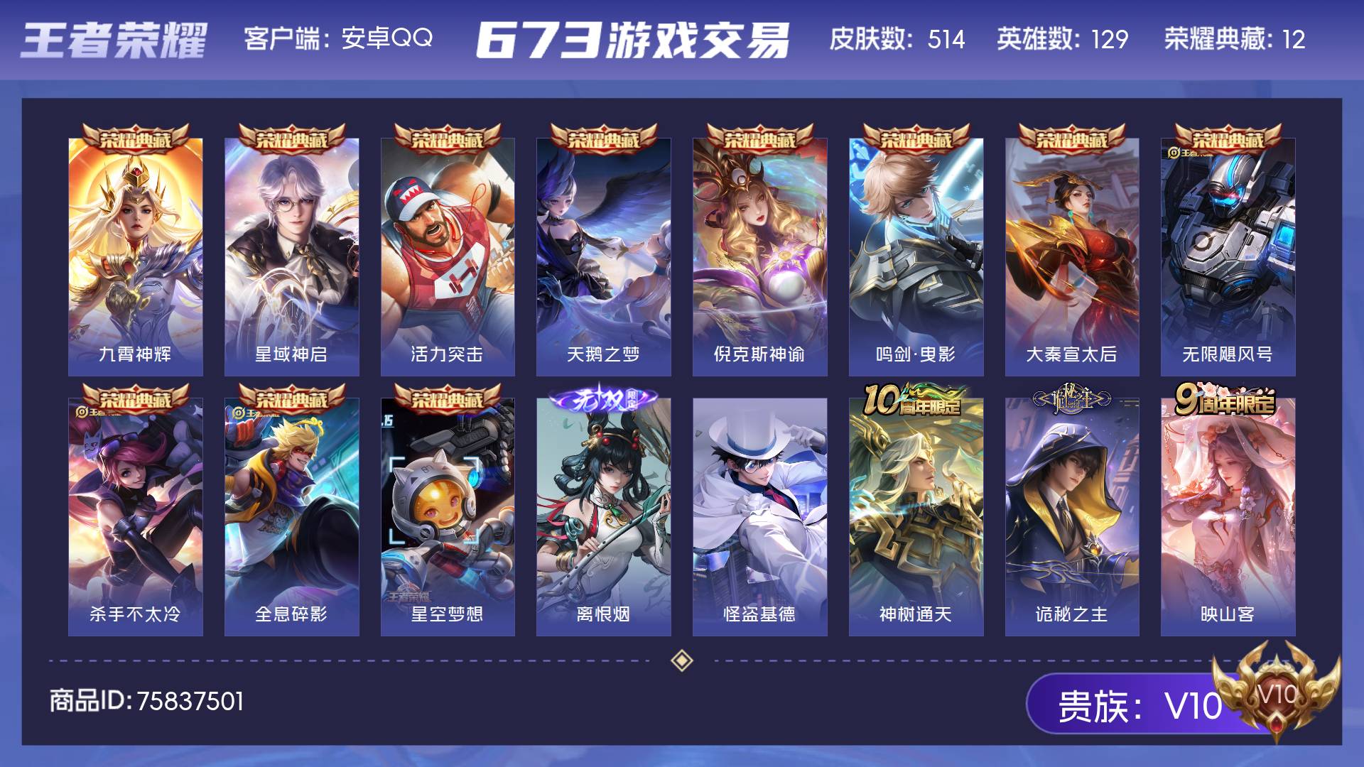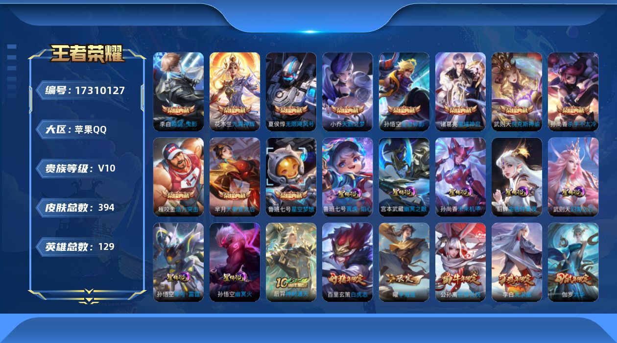 V10 皮肤514 英雄129 非凡王者 荣耀典藏12 无双皮肤1 珍品传说1 传说55 其他皮肤453