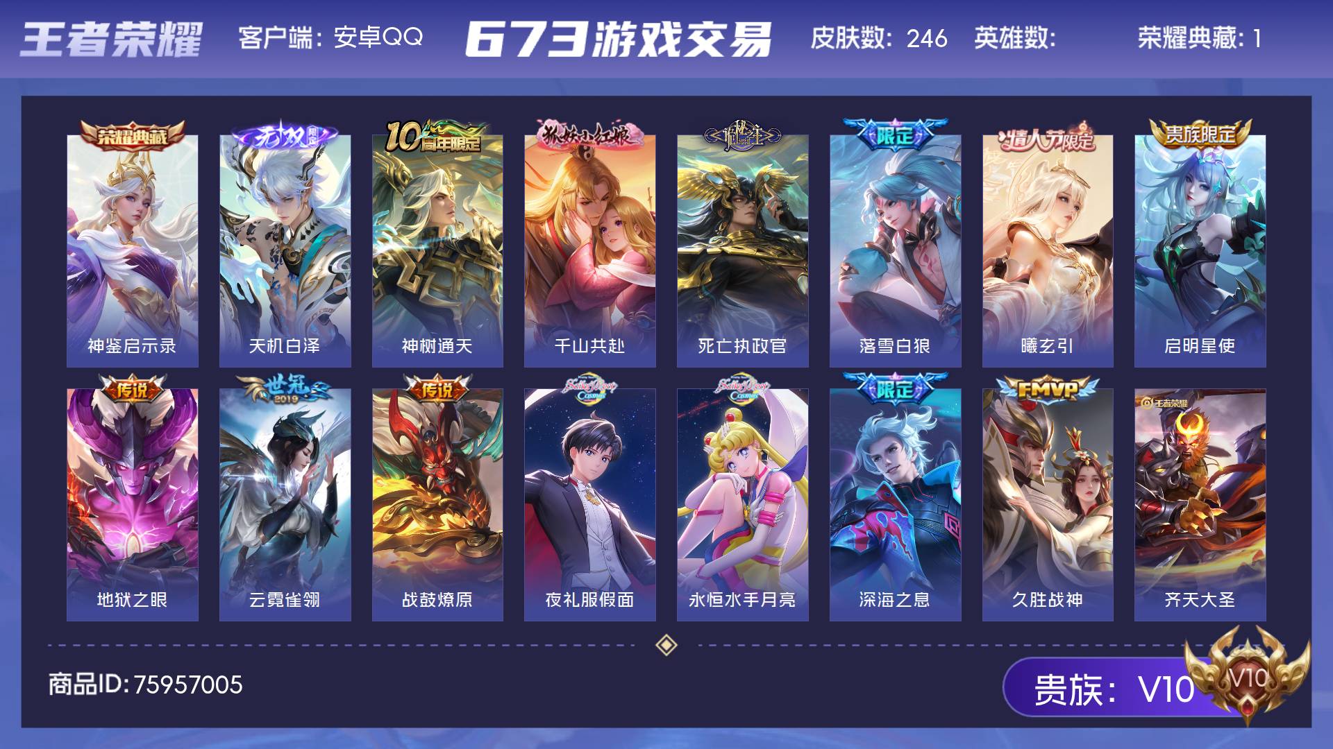 V10 皮肤246 至尊星耀 荣耀典藏1 无双皮肤1 传说15 其他皮肤236