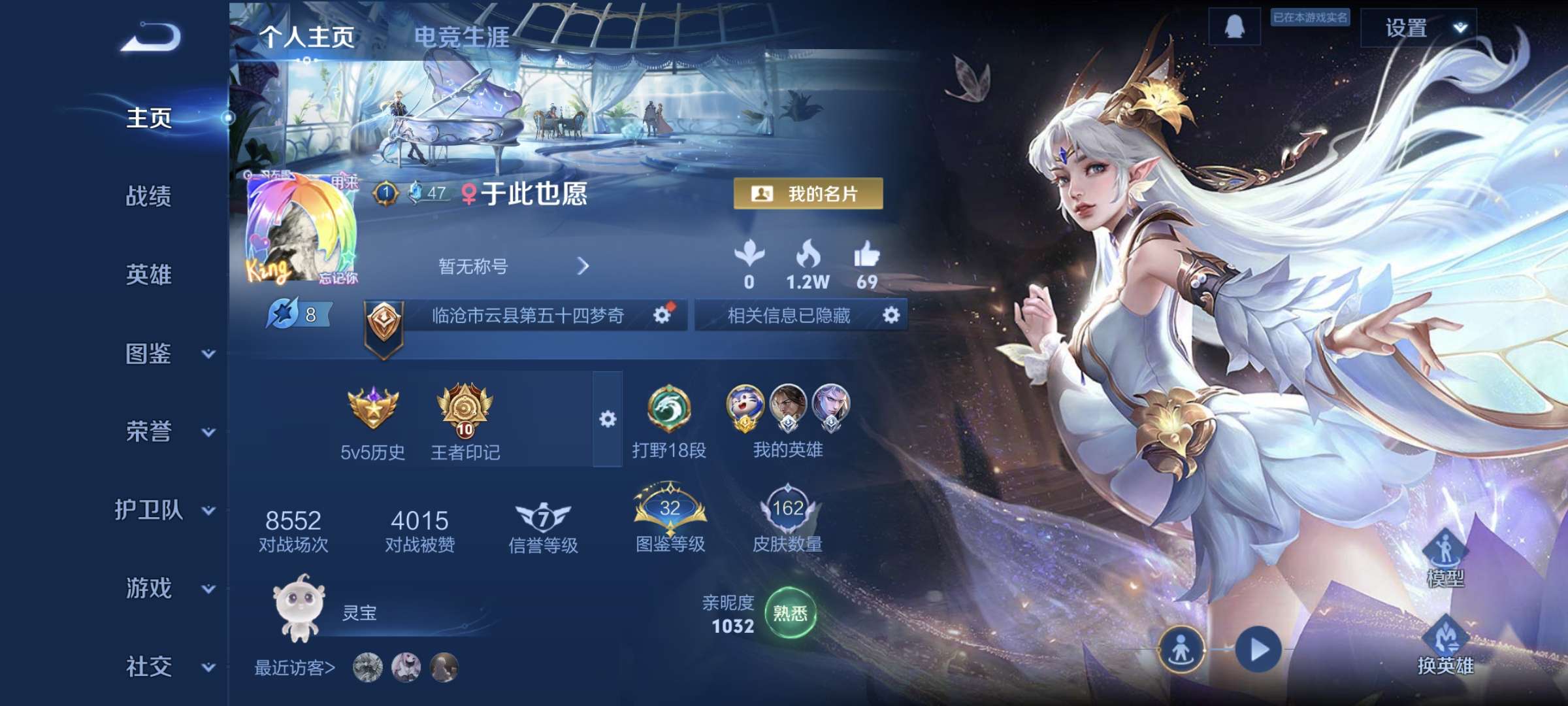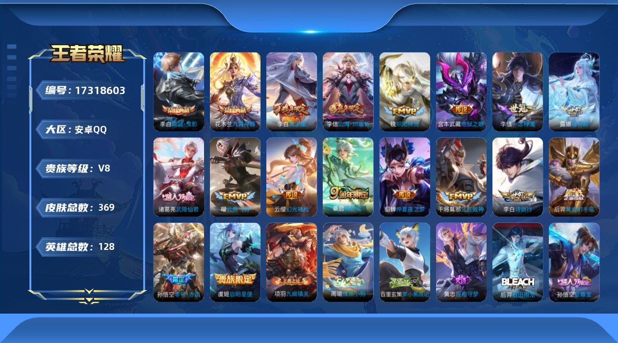 贵族等级: V8 英雄数: 128 皮肤数: 369