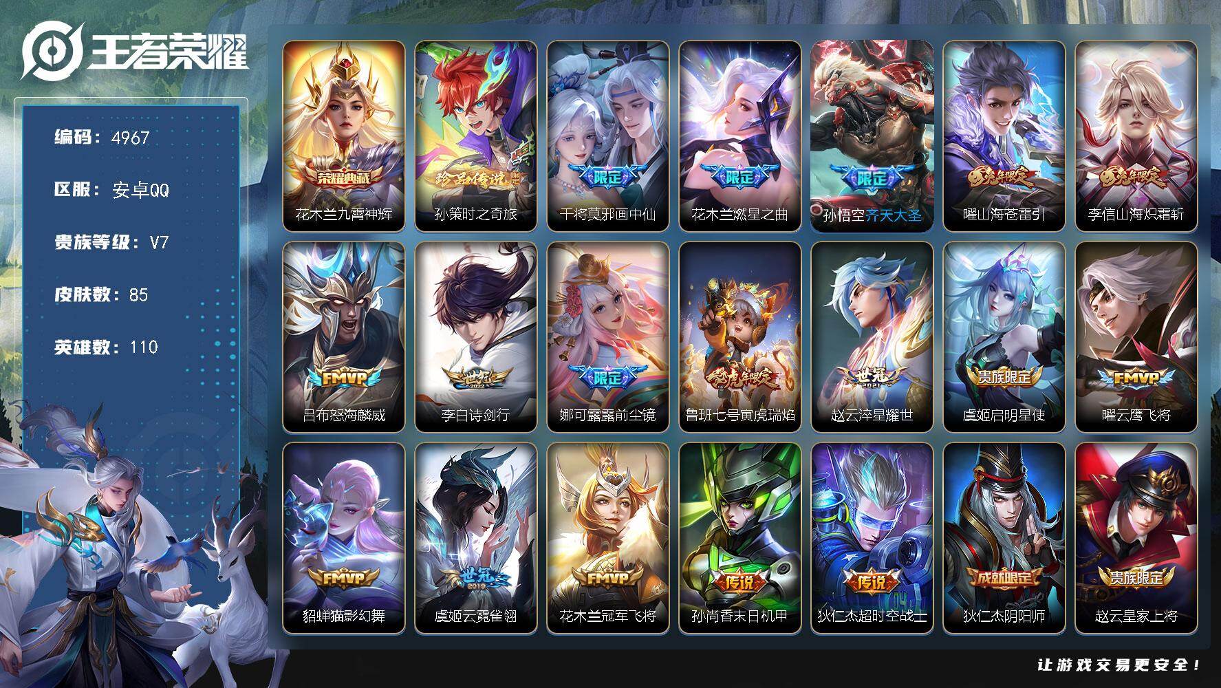 安卓Q-V7-荣耀黄金II段位-110英雄-85皮肤-1典藏皮肤-1珍品传说-