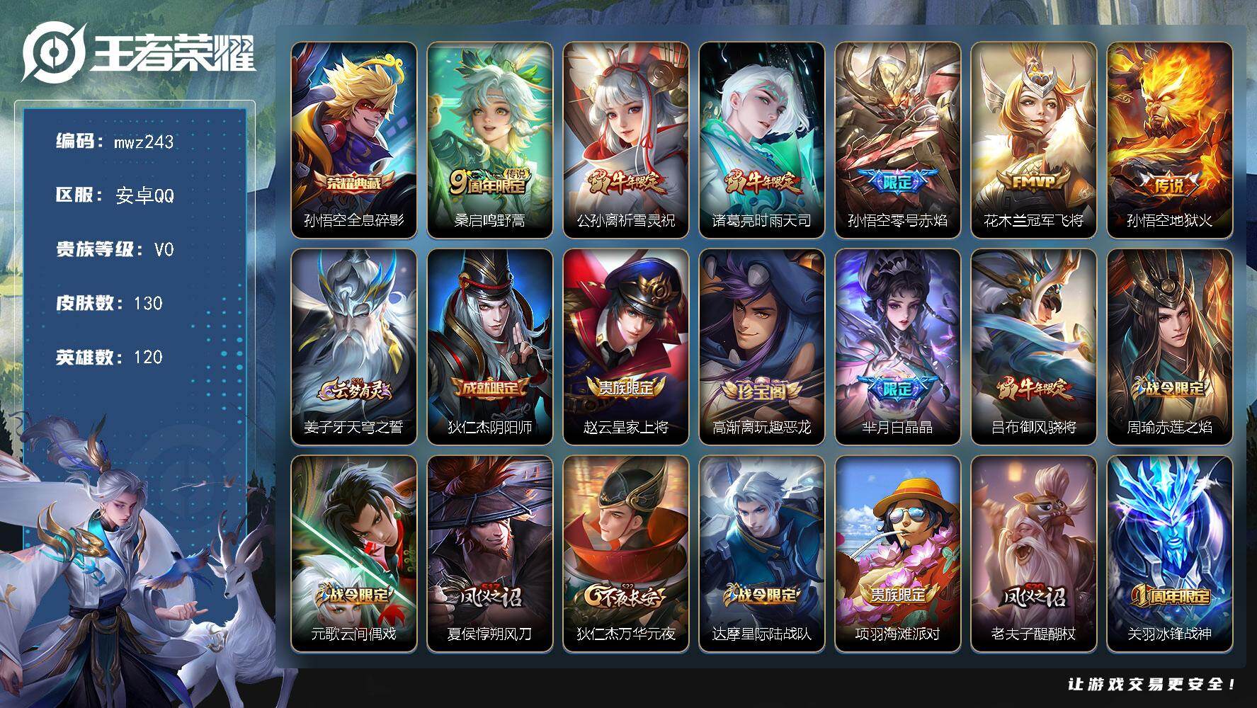 【mwz243】安卓Q-V0-永恒钻石II段位-120英雄-130皮肤-1典藏