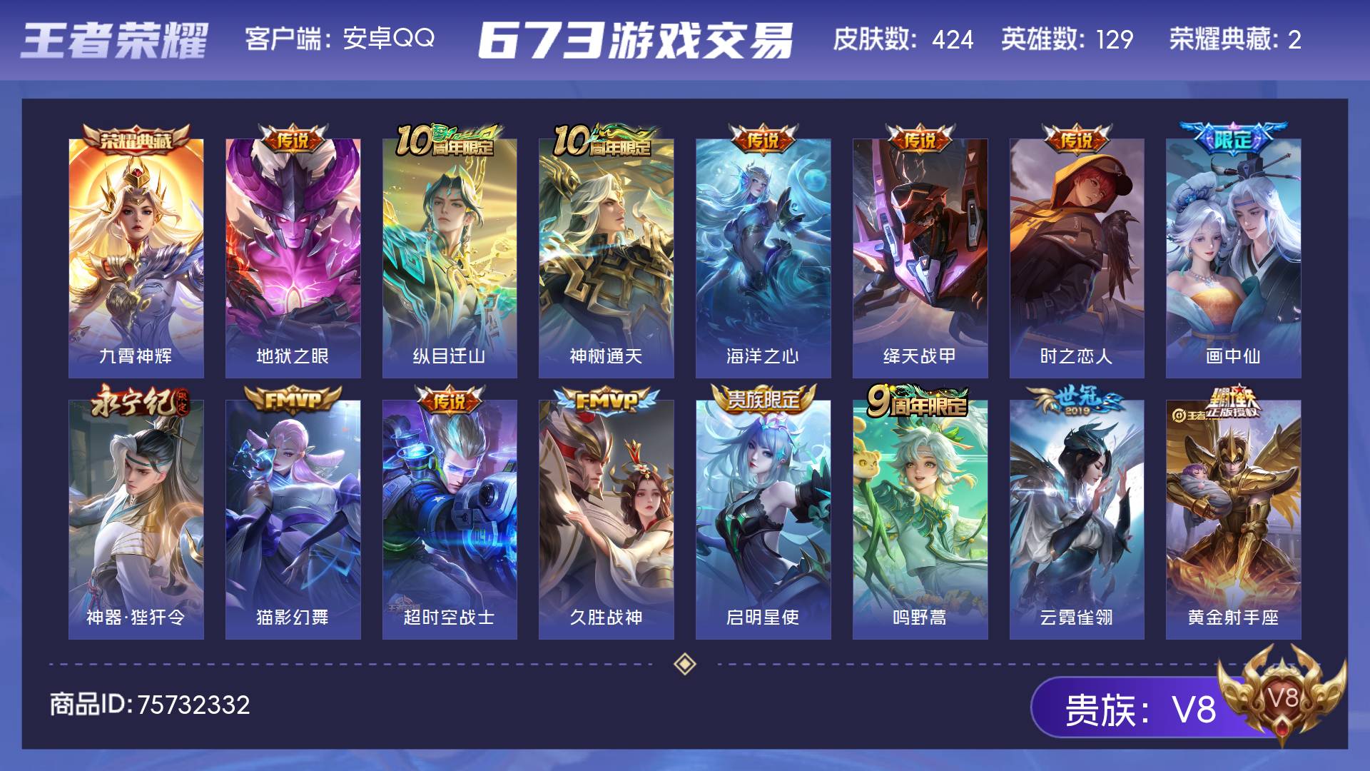 V8 皮肤424 英雄129 无双王者 荣耀典藏2 传说15 其他皮肤413