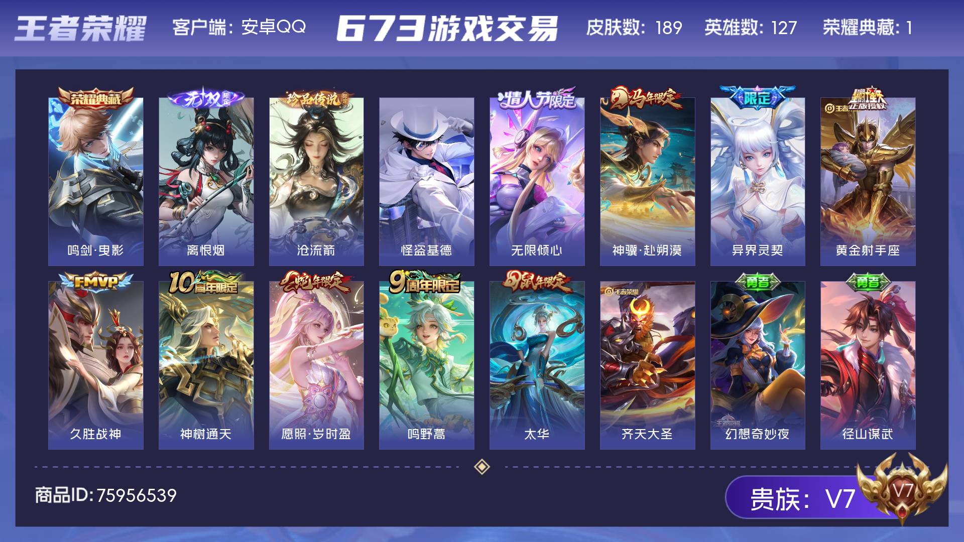 V7 皮肤189 英雄127 最强王者 荣耀典藏1 无双皮肤1 珍品传说2 传说10 其他皮肤182