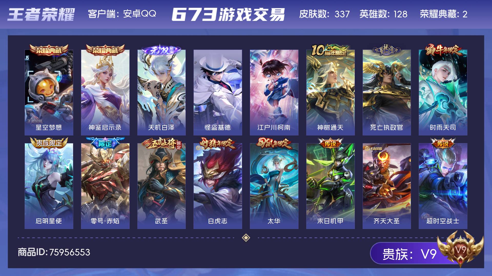 V9 皮肤337 英雄128 最强王者 荣耀典藏2 无双皮肤1 珍品传说2 传说13 其他皮肤326