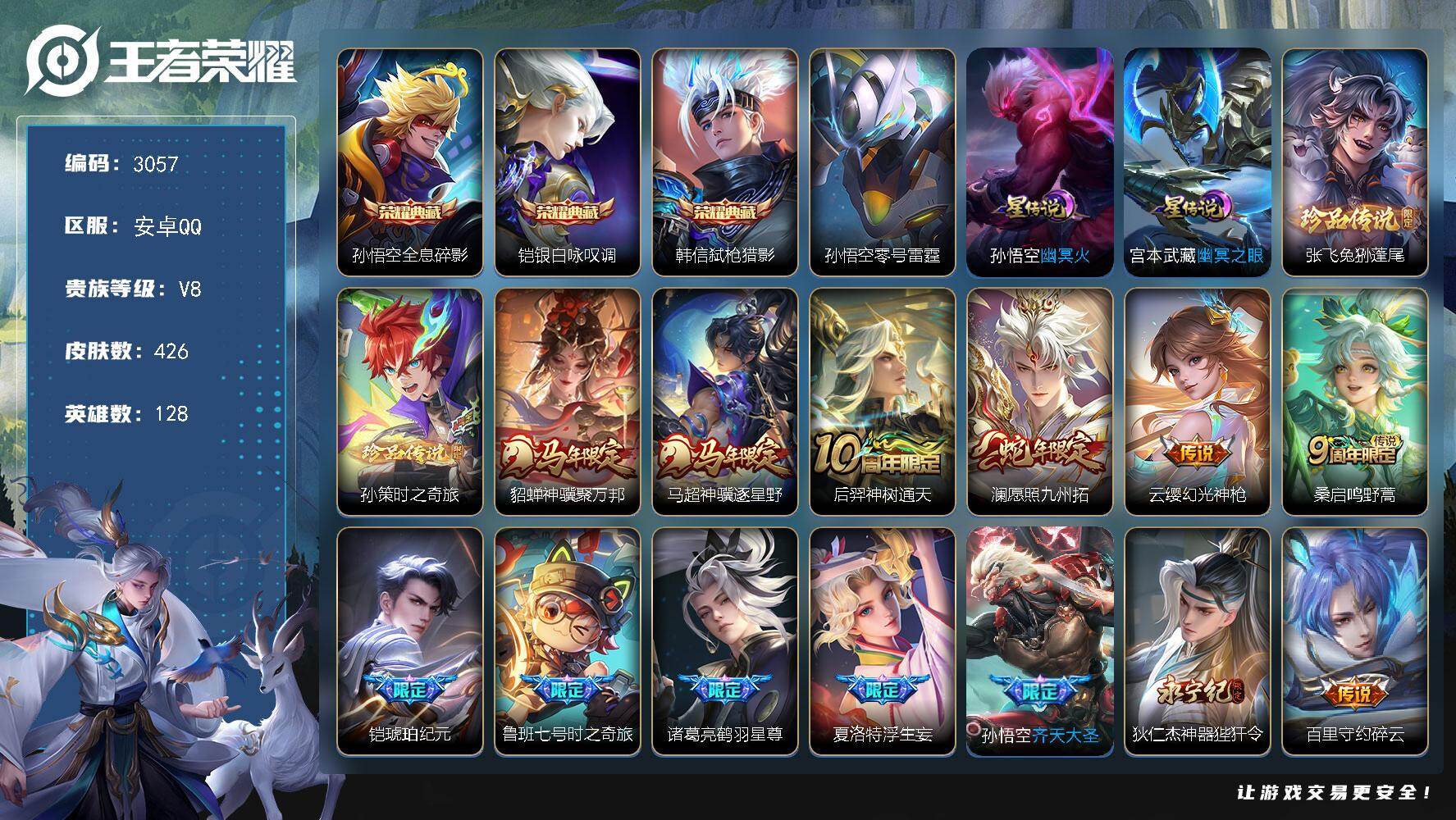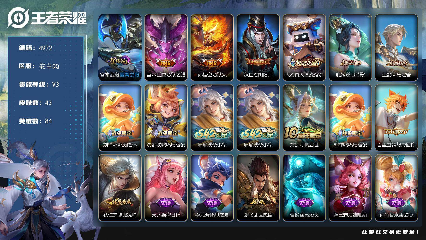 安卓Q-V3-最强王者段位-84英雄-43皮肤-2传说-12史诗【传说皮肤】