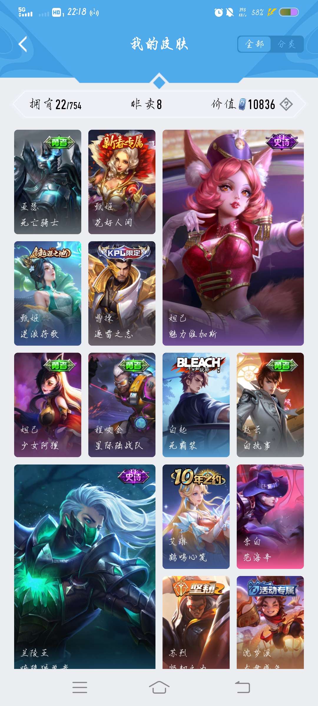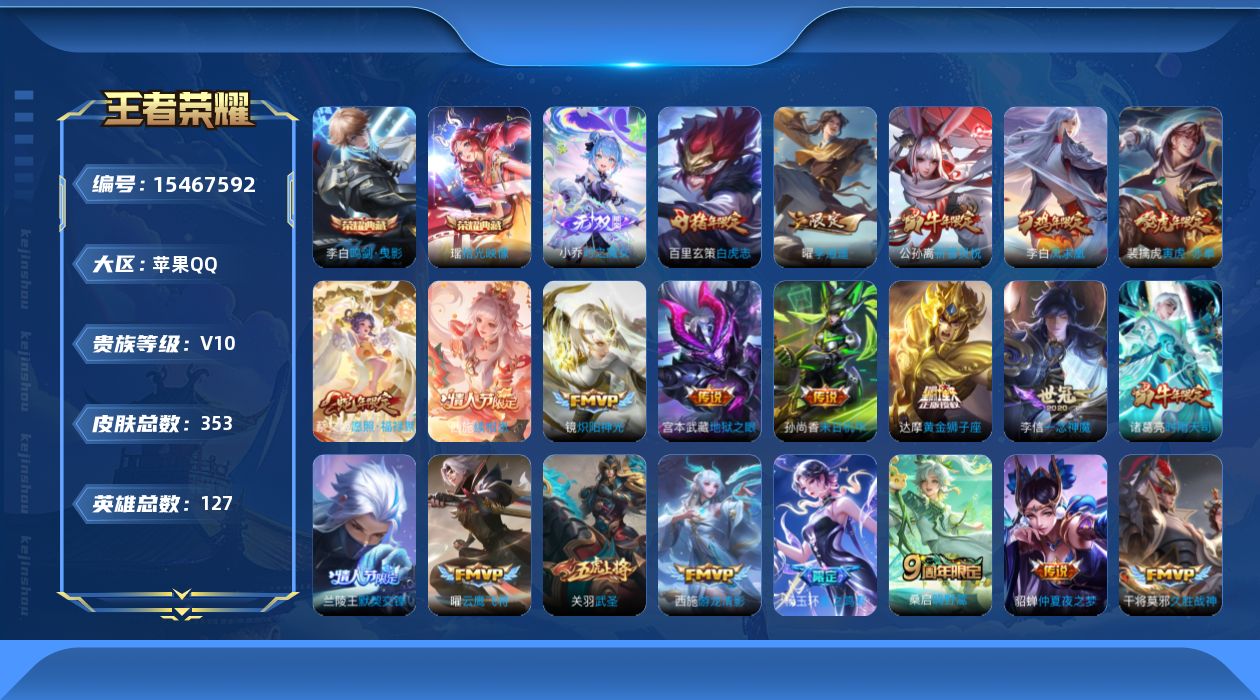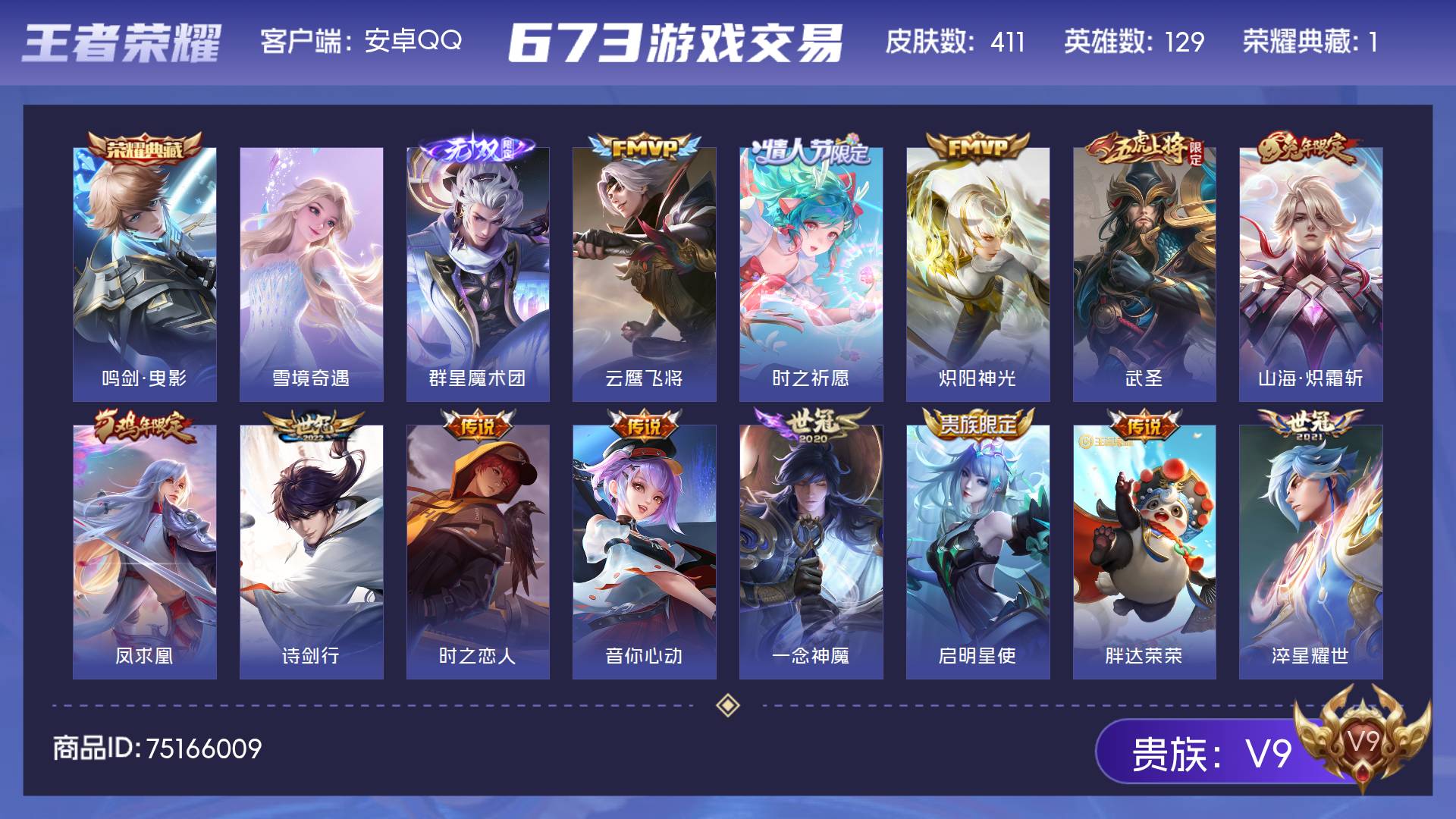 V9 皮肤411 英雄129 至尊星耀 荣耀典藏1 无双皮肤2 星传说2 传说34 其他皮肤379