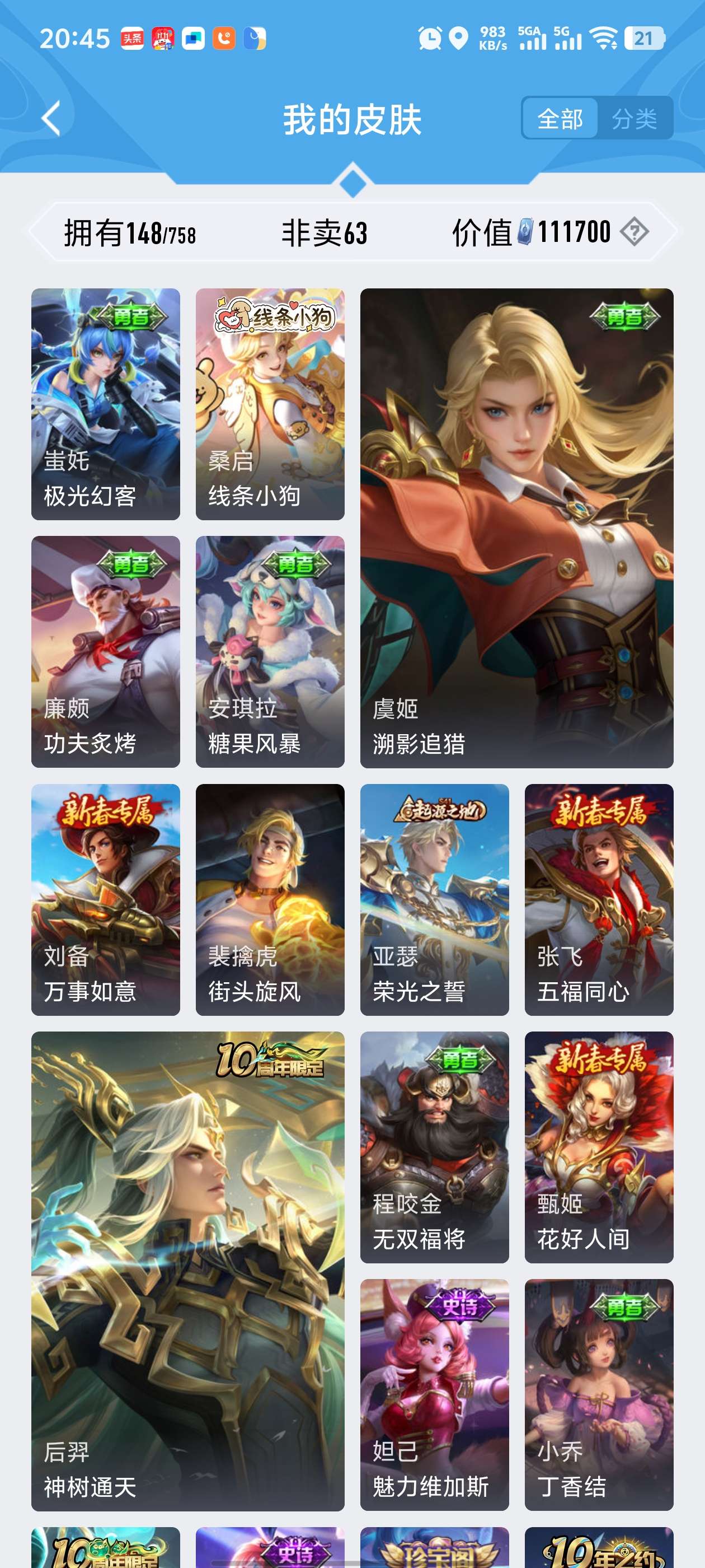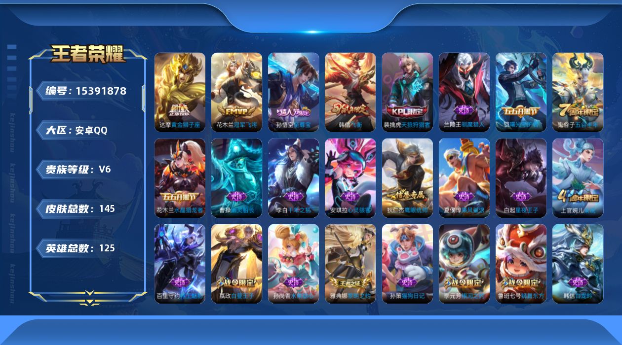 安卓微信 皮肤100 英雄101 典藏3 传说5 其他皮肤41 传奇王者-传奇100星,荣耀典藏:韩信-弑枪猎影,关羽-赤影疾锋,孙悟全息碎影,诗剑仙