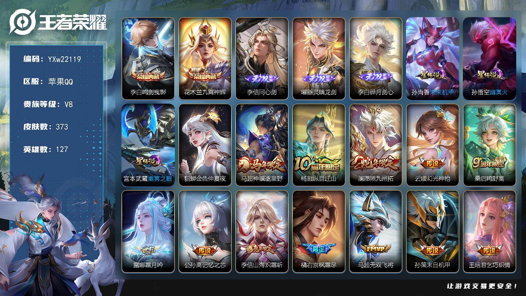127英雄-373皮肤-18王者印记-300铭文-贵族积分8w