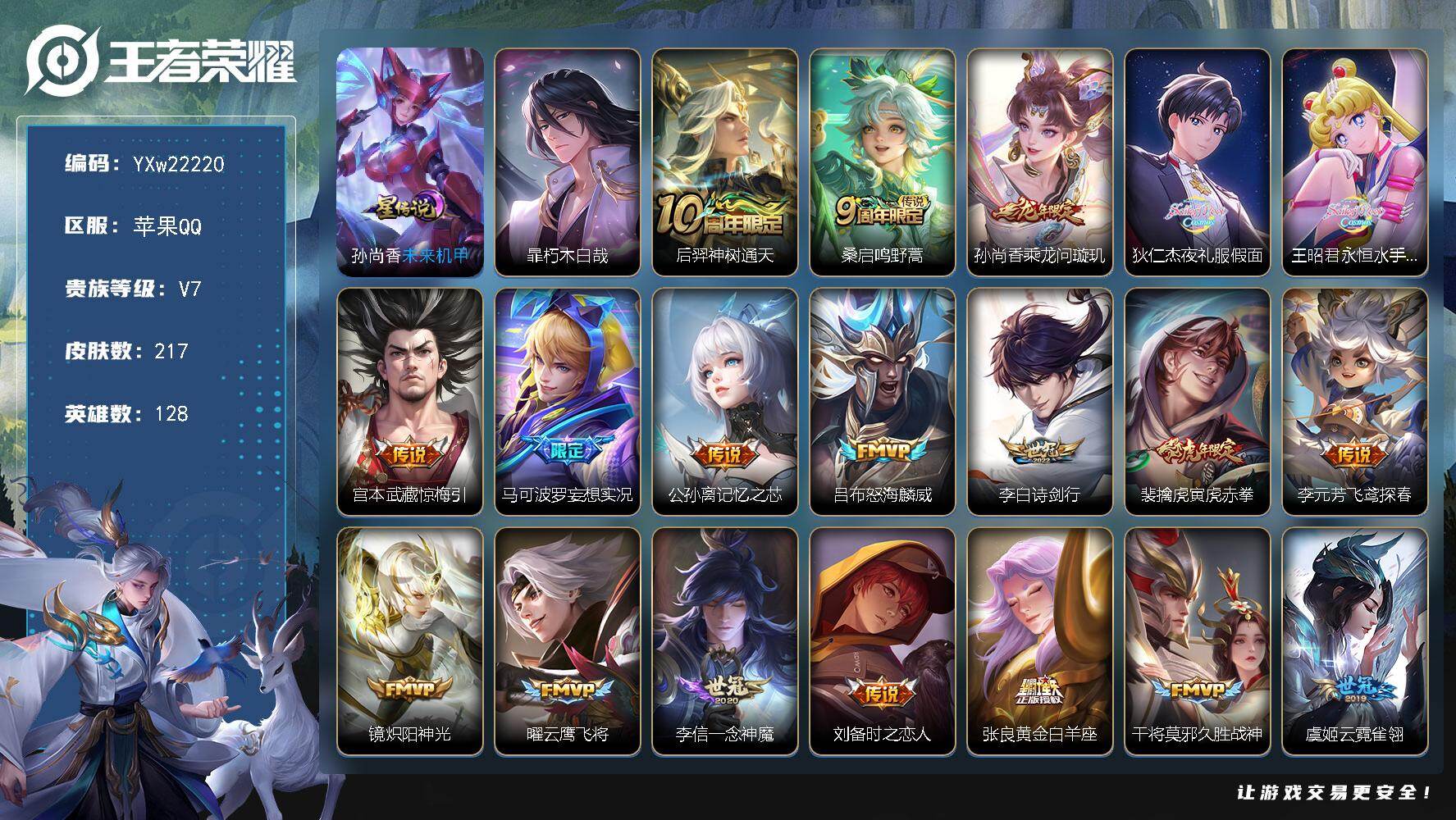 128英雄-217皮肤-10王者印记-230铭文-贵族积分4w