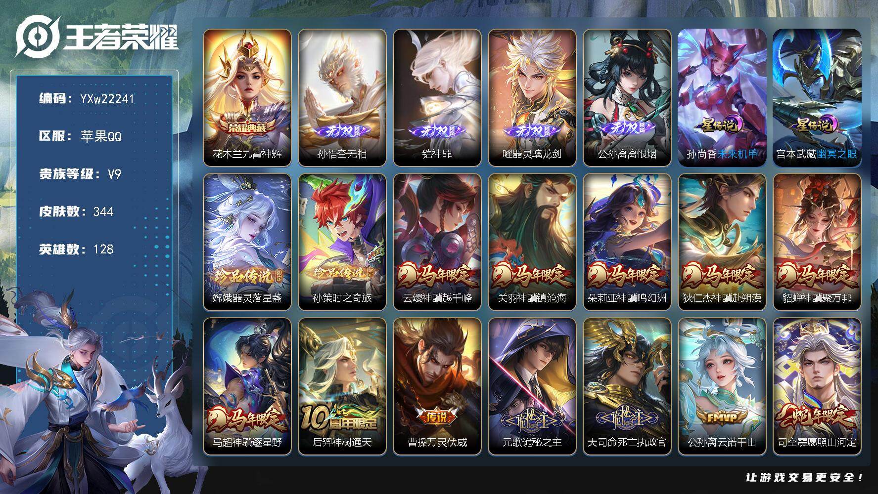 贵族9/皮肤395/典藏3/传说30/史诗113/英雄128/嬴政全皮/姜子牙全