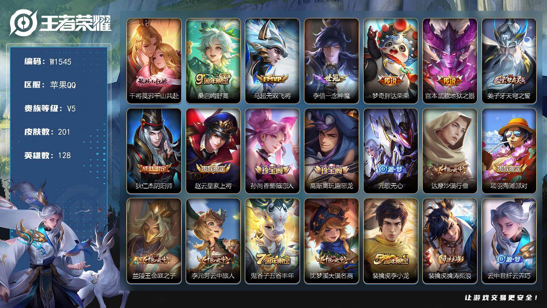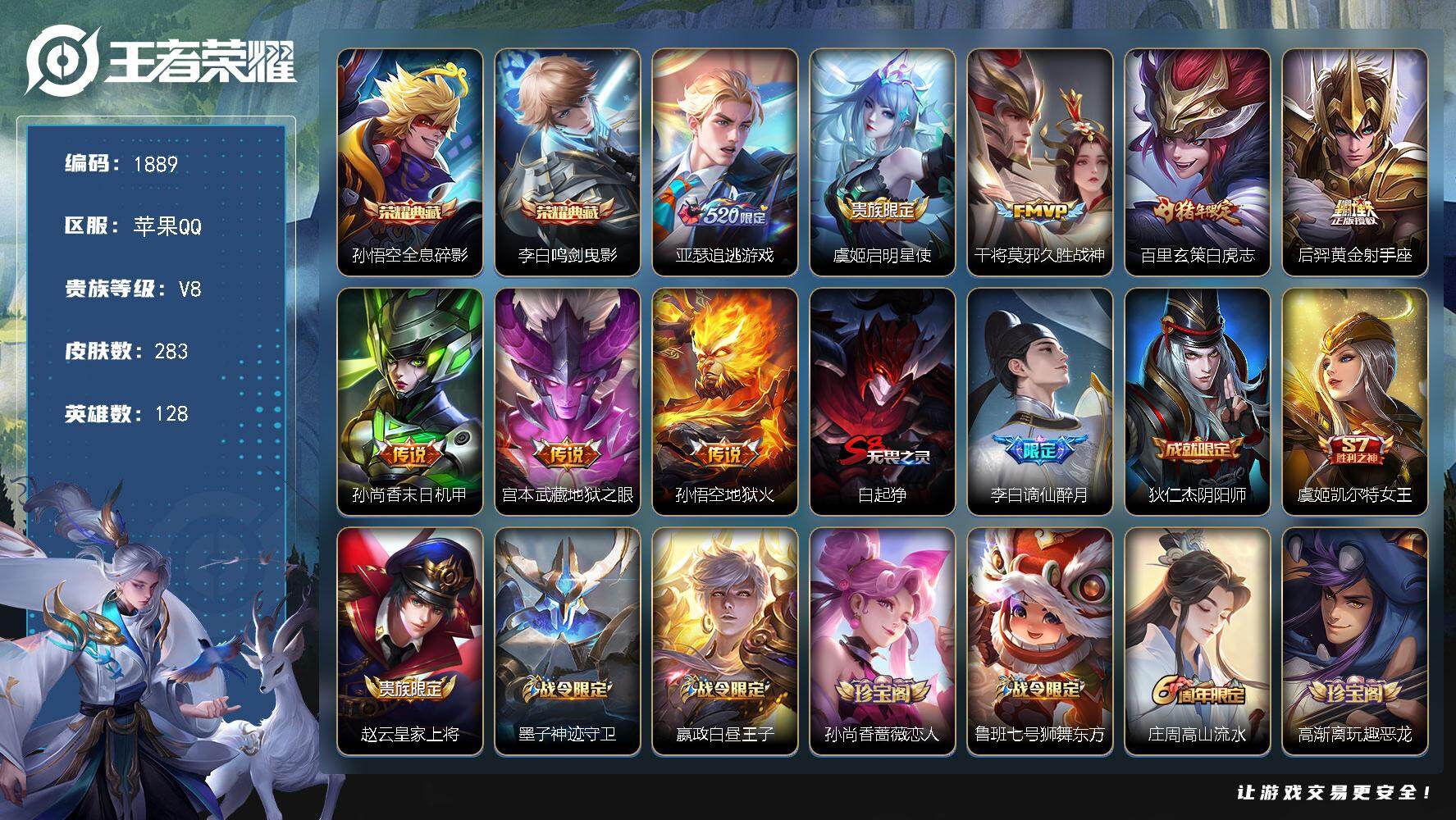 苹果Q-V4-最强王者段位-31英雄-20皮肤-4无双-1珍品传说-3传说-5