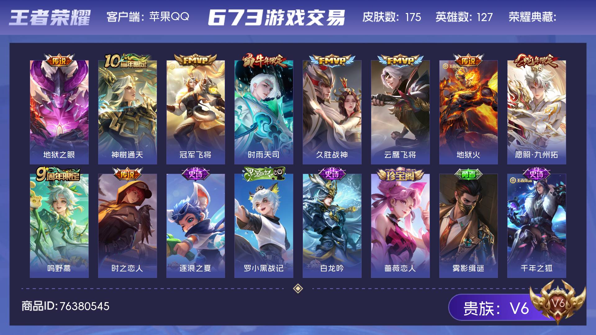 V6 皮肤175 英雄127 尊贵铂金 传说10