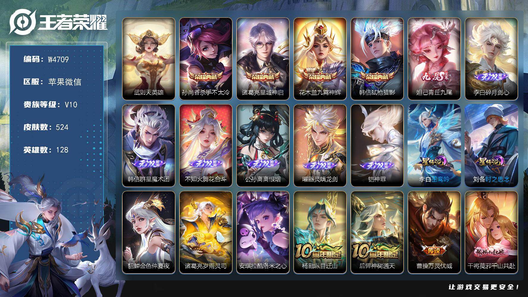 无二次-贵10-128英雄-524皮肤-5典藏(武则天)-7无双-1珍品传说-81传说-4天幕-5星元-42按键-4专属播报